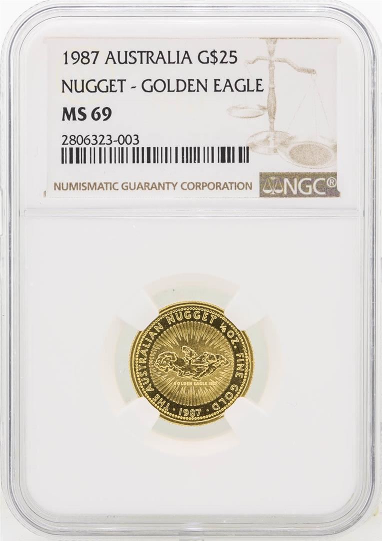 One 1987 NGC MS69 Australia $25 Nugget Golden Eagle Gold Coin.