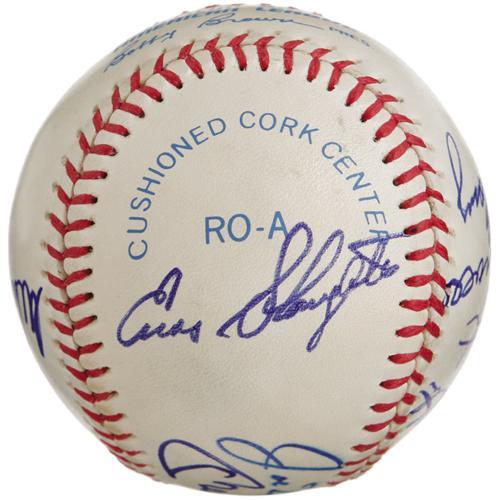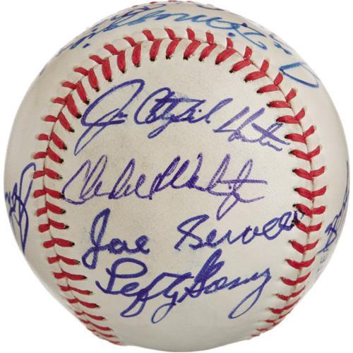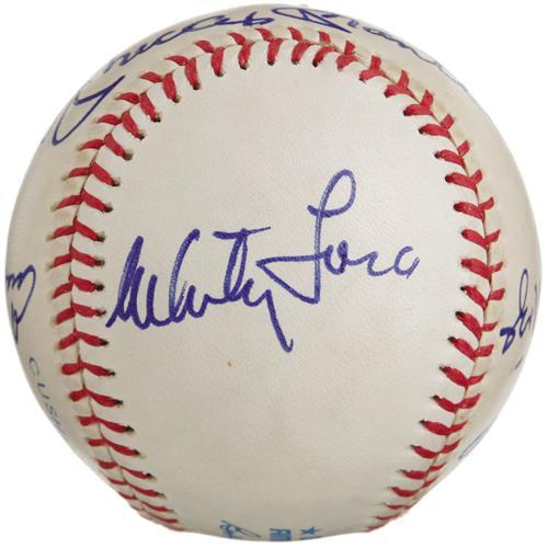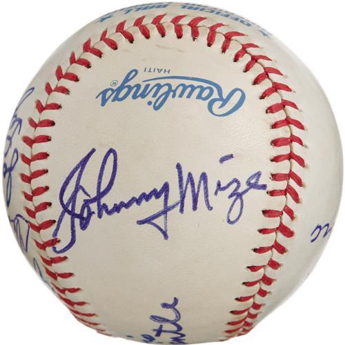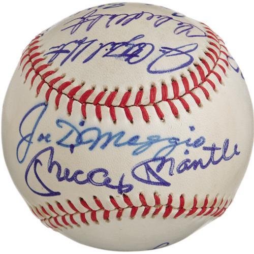 <B>1987 New York Yankees Hall of Fame Day Multi-Signed Baseball.</B></I> Blindingly bold autographs from pinstriped legends is the theme of this OAL (Brown) ball, anchored by sweet spot signatures from DiMaggio and Mantle. Joining these center field superheroes are Ford, Mize, Hunter, Sewell, Gomez, Slaughter and (oddly) Claudell Washington. There's still plenty of room to add folks like Berra, Rizzuto, Jeter, etc. if the winning bidder desires, and surely any of those guys would be very pleased to be asked to join the present cast of characters. <I>LOA from PSA/DNA. LOA from James Spence Authentication.</B></I><BR><BR><b>Shipping:</b> Balls, Pucks, etc., Small (<a target="_blank" href="http://www.heritageauctions.com/common/shipping.php">view shipping information</a>)