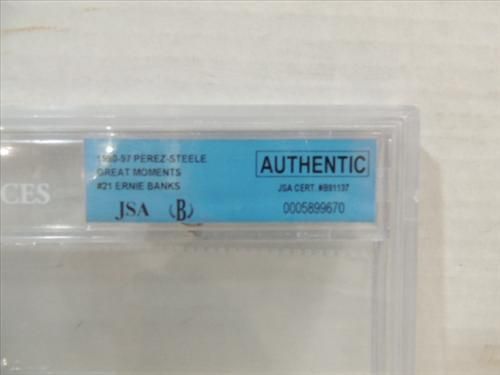 1987 PEREZ-STEELE CARD #21 AUTOGRAPH ERNIE BANKS. INLCUDES AUTHENTICATION FROM BECKETT #5899670 , JSA #B81137 & GAI #GV44200. AS SHOWN. VIEW PICTURE FOR DETAIL.
