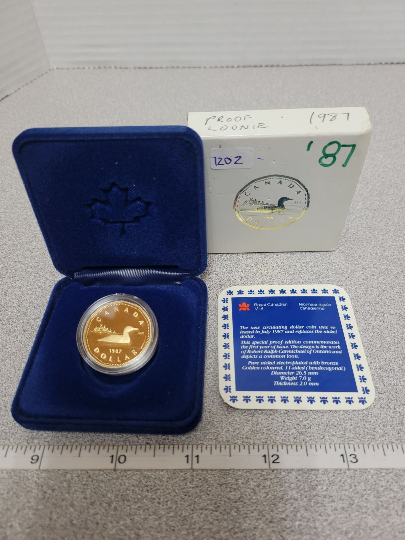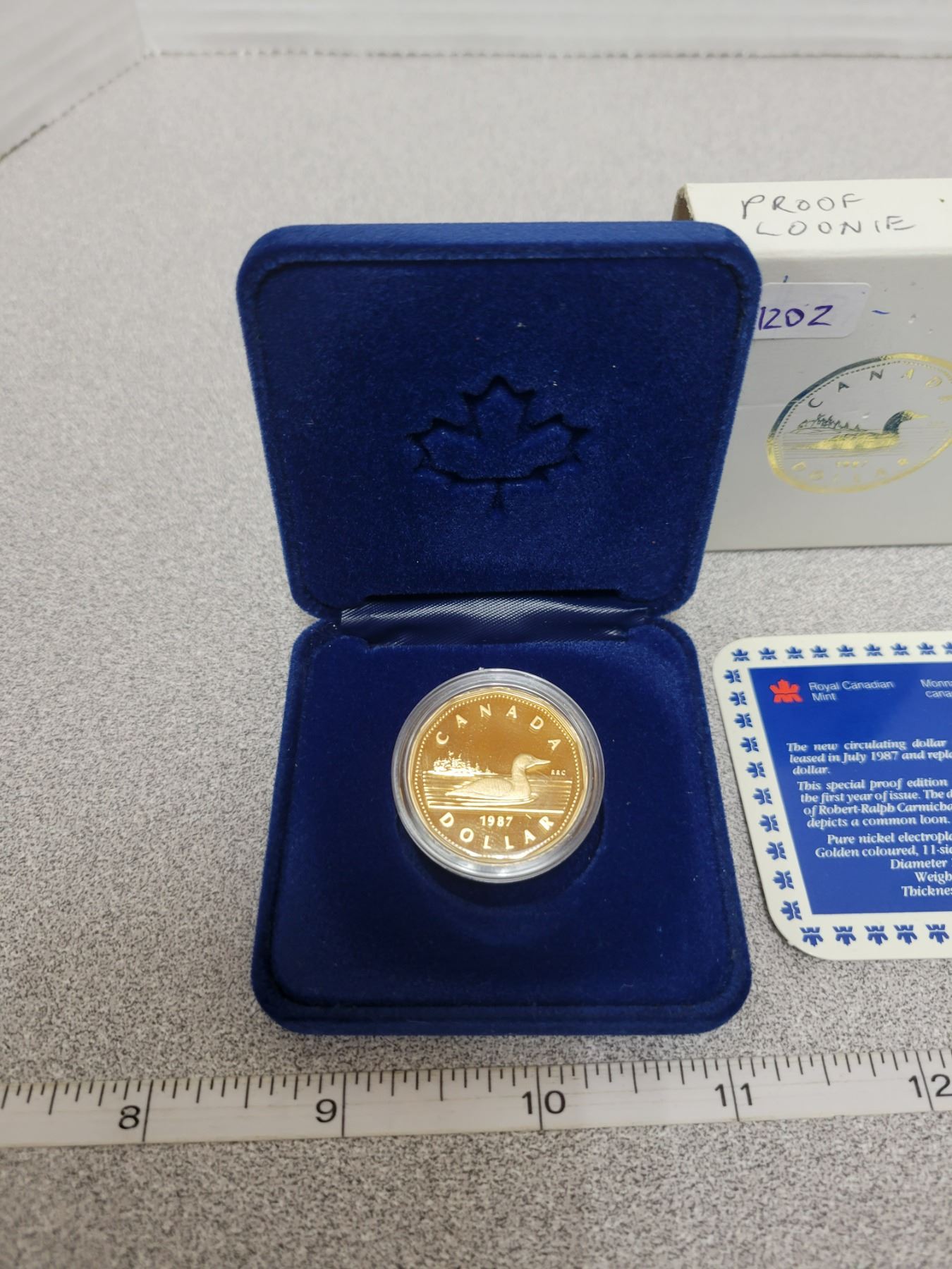 1987 Proof Loonie. The first Proof Loonie. Housed in its original case & box of issue.