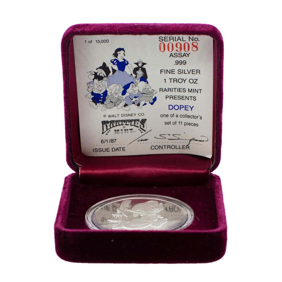 One 1987 Rarities Mint Disney Dopey 1oz Silver Proof Coin w/Box & COA.