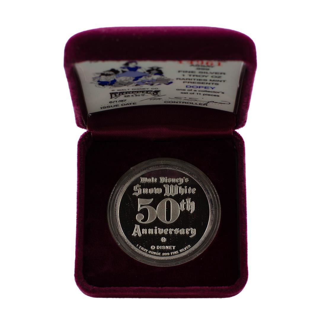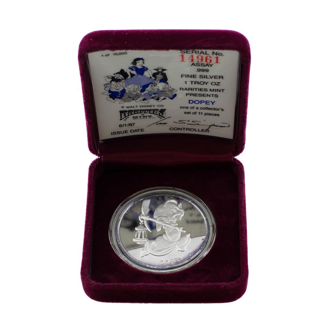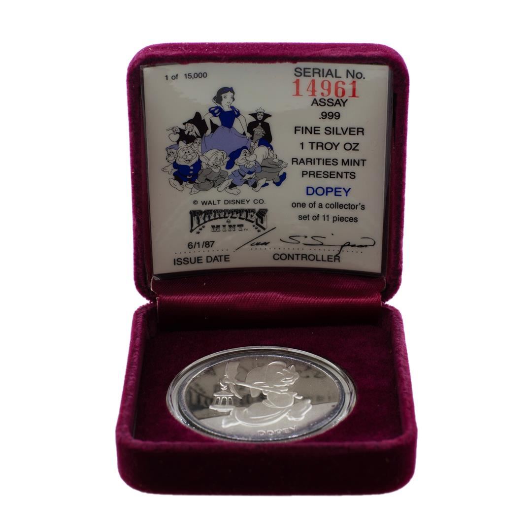 One 1987 Rarities Mint Disney Dopey 1oz Silver Proof Coin w/Box & COA.