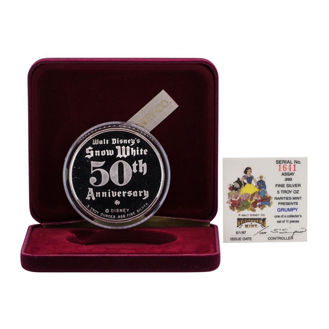 One 1987 Rarities Mint Walt Disney Snow White Grumpy 5oz .999 Silver Coin w/Box & COA.