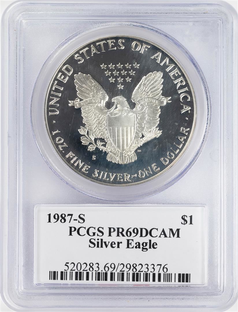 One 1987-S $1 Proof American Silver Eagle Coin PCGS PR69DCAM Moy Signature. PCGS Graded.