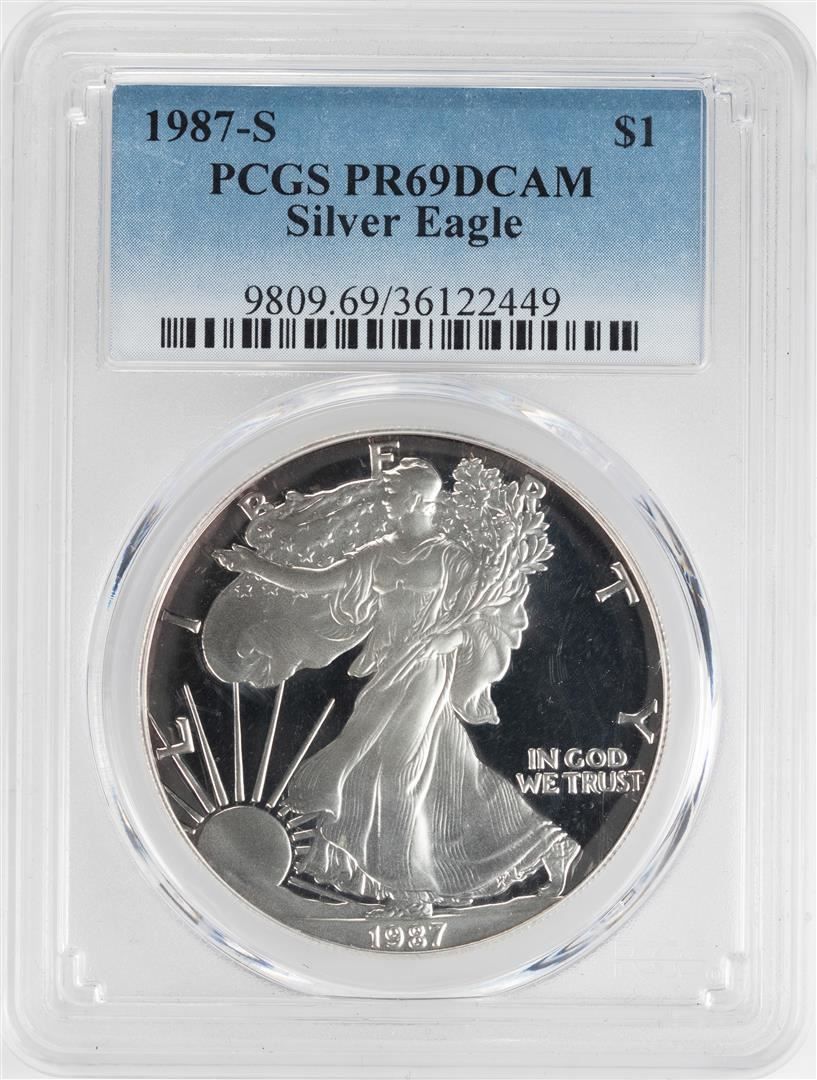 One 1987-S $1 Proof American Silver Eagle Coin PCGS PR69DCAM. PCGS Graded.