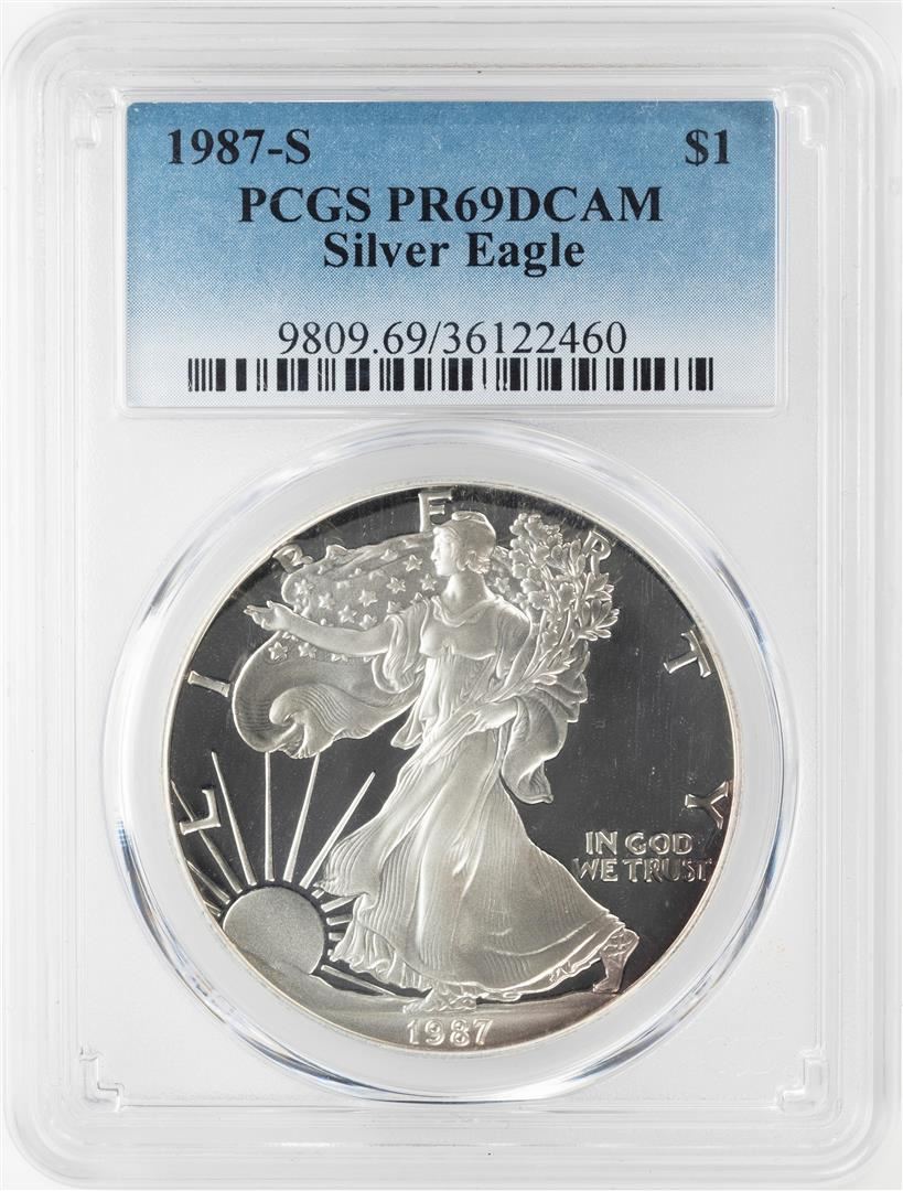 One 1987-S $1 Proof American Silver Eagle Coin PCGS PR69DCAM. PCGS Graded.