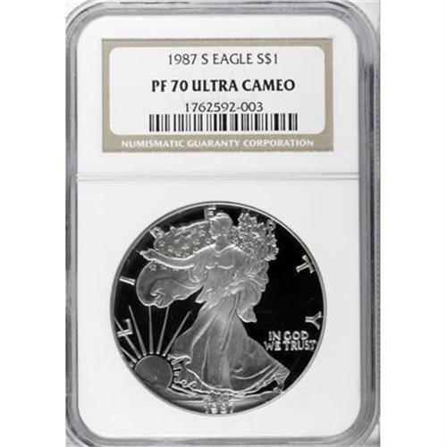 <B>1987-S $1 Silver Eagle PR70 Deep Cameo NGC.</B></I> NGC Census: (242/0). PCGS Population (12/0). Mintage: 904,732. Numismedia Wsl. Price for NGC/PCGS coin in PR70: $850. (#9809)<BR><BR><b>Shipping:</b> Coins & Currency (<a target="_blank" href="http://www.heritageauctions.com/common/shipping.php">view shipping information</a>)