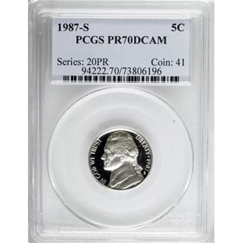 <B>1987-S 5C PR70 Deep Cameo PCGS.</B></I> PCGS Population (10/0). NGC Census: (4/0). Numismedia Wsl. Price for NGC/PCGS coin in PR70: $800. (#94222)<BR><BR><b>Shipping:</b> Coins & Currency (<a target="_blank" href="http://www.heritageauctions.com/common/shipping.php">view shipping information</a>\)