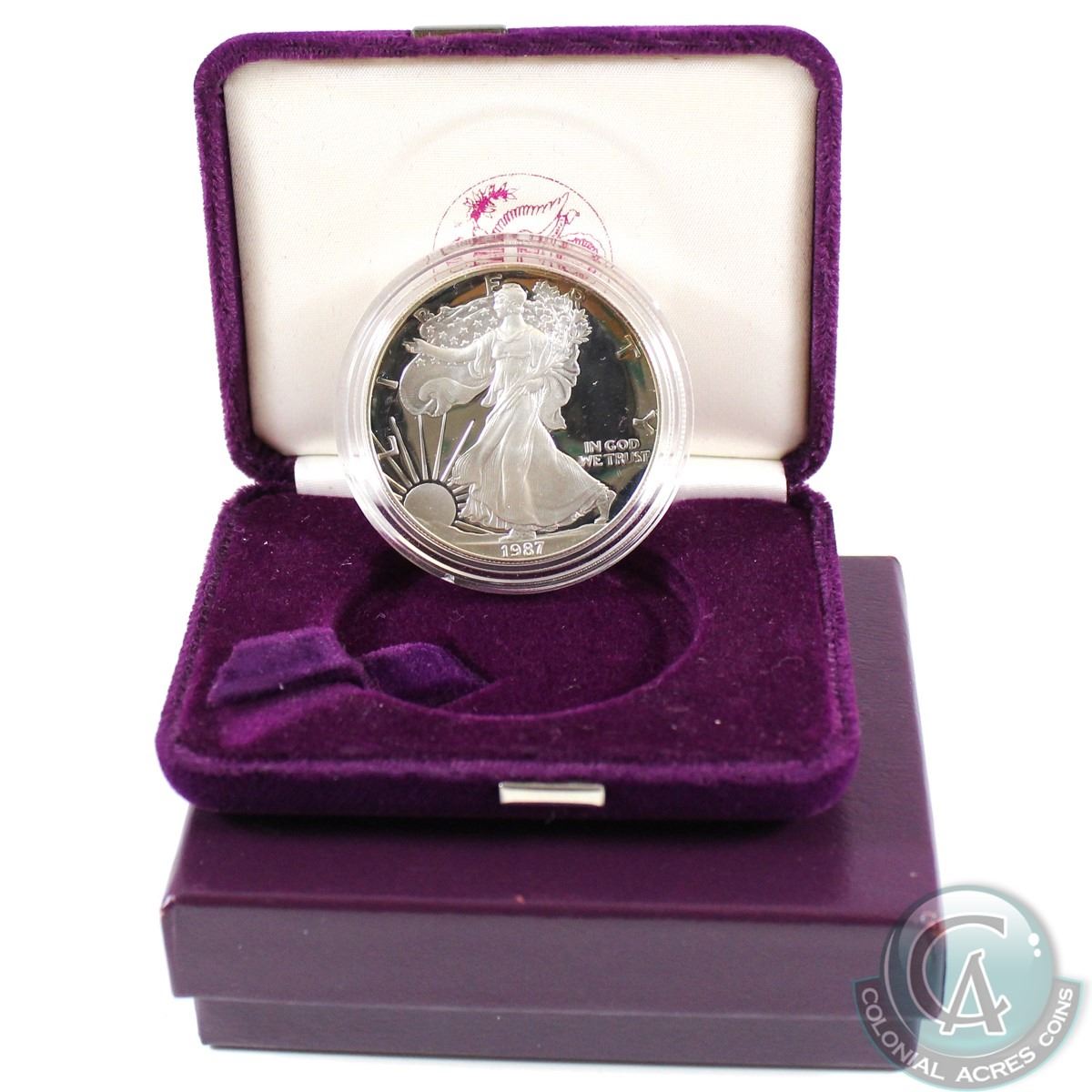 1987-S (San Francisco) AMERICAN EAGLE One Ounce Mirror "PROOF" Version WALKING LIBERTY Silver Bullion coin with EAGLE with shield encapsulated in a special holder complete with the U.S. Mint box and Certificate of Authenticity (TAX Exempt)