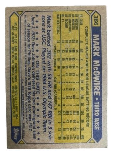 1987 Topps Mark McGwire Oakland A's rookie trading card #366.