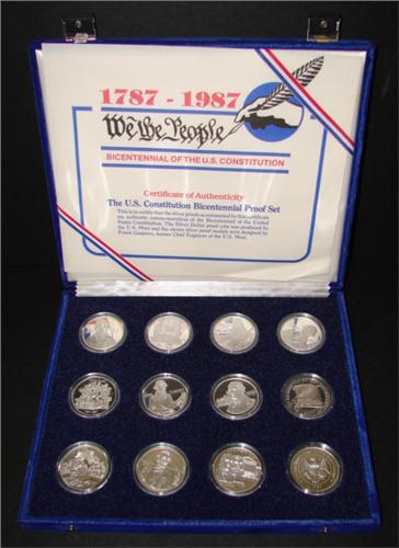 1987 U.S. CONSTITUTION BICENTENNIAL PROOF SET. Includes one $1 silver proof coin and eleven silver proof medals. Coins rest in velvet case.