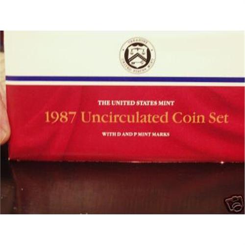 This 1987 Uncirculated Coin Set features the P and D Mint Marks. The set consists of 10 coins, including 2 Kennedy Half-Dollars, 2 Washington Quarters, 2 Roosevelt dimes, 2 Jefferson Nickels, and 2 Lincoln Pennies, one from each Mint. There is an attractive specification card, which provides information about each of the coins, in the special envelope that was produced for the 1987 Uncirculated Coin Set. I am the original owner and I acquired them directly from the Mint in the year of issue.