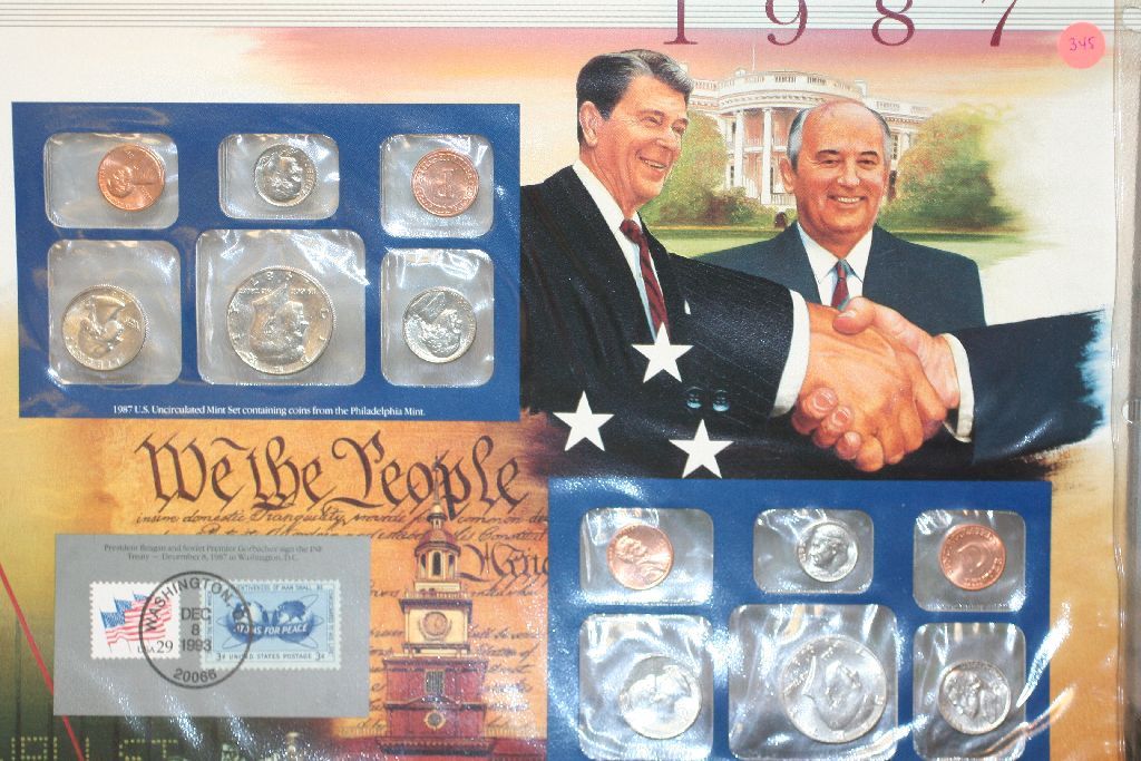 1987 US Mint Coin Set Commerating Reagan & Gorbachev Signing the INF Treaty W/Postal Stamps; P&D Mints, UNC Dated 1993