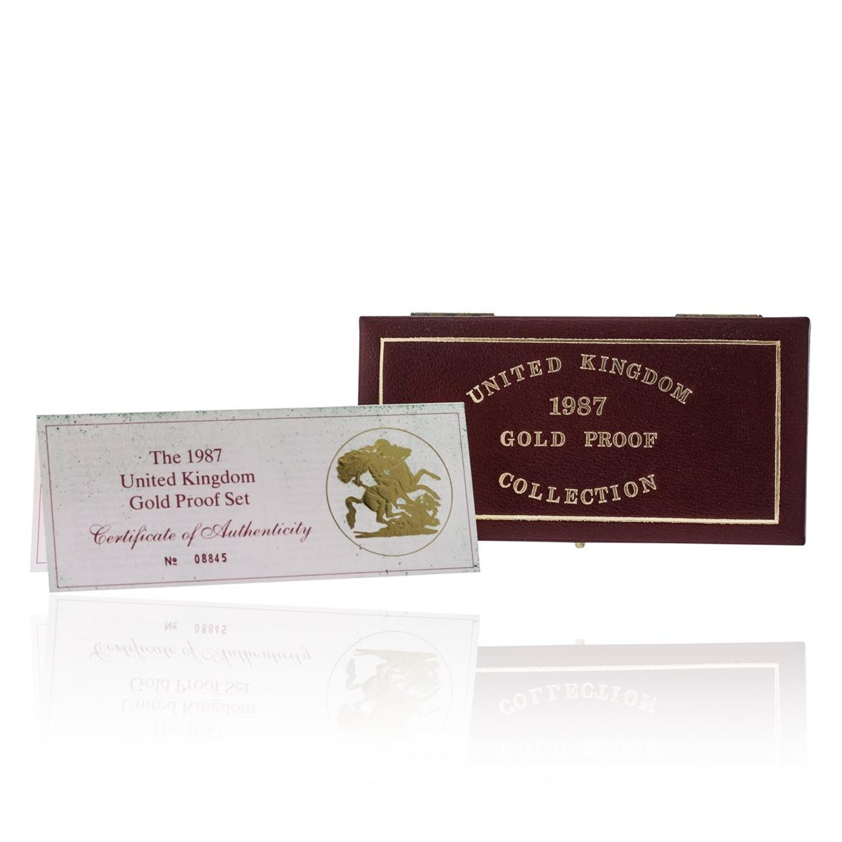 1987 United Kingdom Gold Proof Set complete with Original Box and Inserts. This set includes (3) 22 carat Gold Coins in Proof and Original Capsules. The three coins are broken down into (1) "Two Pounds" gold coin weighing 15.98 Grams, (1) "Sovereign" gold coin weighing 7.98 Grams, and (1) "Half Sovereign" gold coin weighing 3.99 Grams.