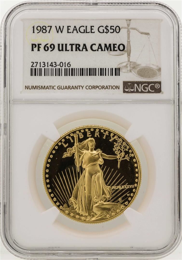 One 1987-W $50 American Gold Eagle Coin NGC PF69 Ultra Cameo. NGC Certified.