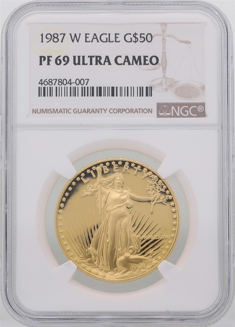 One 1987-W $50 American Gold Eagle Coin NGC PF69 Ultra Cameo. NGC Certified.