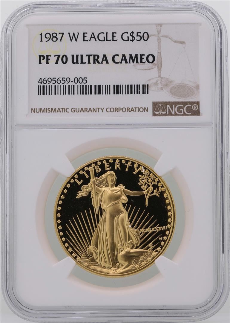 One 1987-W $50 American Gold Eagle Coin NGC PF70 Ultra Cameo. NGC Certified.