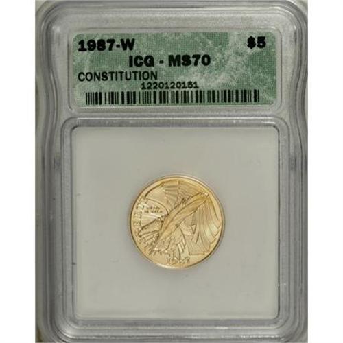 <B>1987-W G$5 Constitution Gold Five Dollar MS70 ICG.</B></I> NGC Census: (3343/0). PCGS Population (275/0). Mintage: 214,225. Numismedia Wsl. Price for NGC/PCGS coin in MS70: $224. (#9626)<BR><BR><b>Shipping:</b> Coins & Currency (<a target="_blank" href="http://www.heritageauctions.com/common/shipping.php">view shipping information</a>)