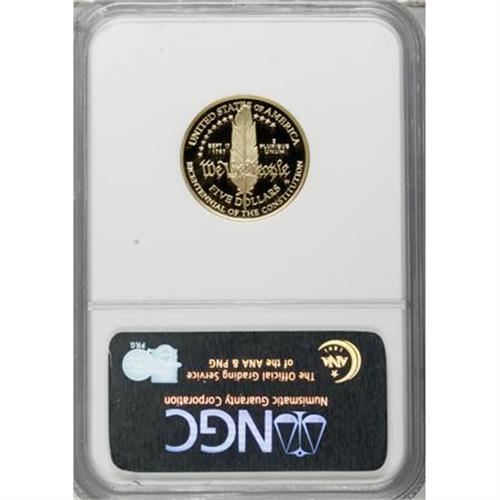 <B>1987-W G$5 Constitution Gold Five Dollar PR70 Deep Cameo NGC.</B></I> NGC Census: (7/0). PCGS Population (88/0). Mintage: 651,659. Numismedia Wsl. Price for NGC/PCGS coin in PR70: $300. (#9627)<BR><BR><b>Shipping:</b> Coins & Currency (<a target="_blank" href="http://www.heritageauctions.com/common/shipping.php">view shipping information</a>)