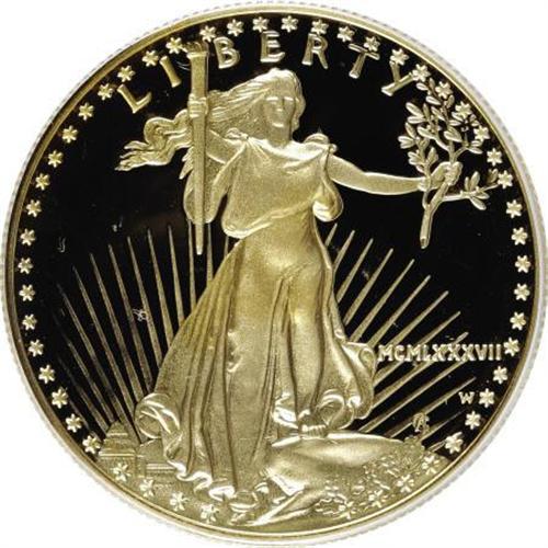 <B>1987-W G$50 One-Ounce Gold Eagle PR69 Deep Cameo PCGS.</B></I> PCGS Population (3203/107). NGC Census: (1522/737). Mintage: 147,498. Numismedia Wsl. Price for NGC/PCGS coin in PR69: $765. (#9815)<BR><BR><b>Shipping:</b> Coins & Currency (<a target="_blank" href="http://www.heritageauctions.com/common/shipping.php">view shipping information</a>)