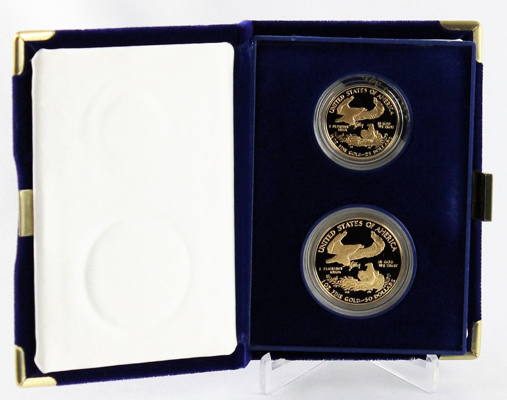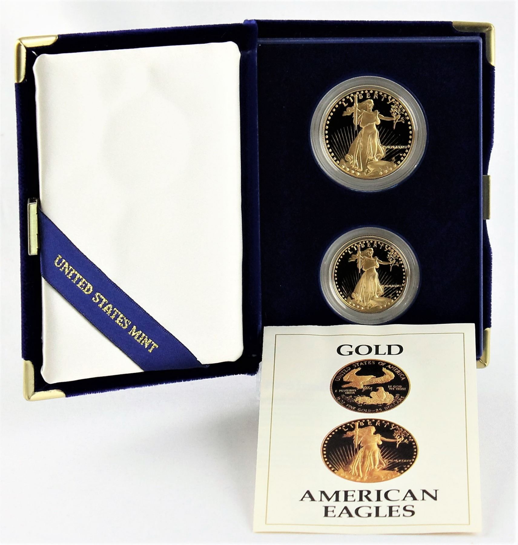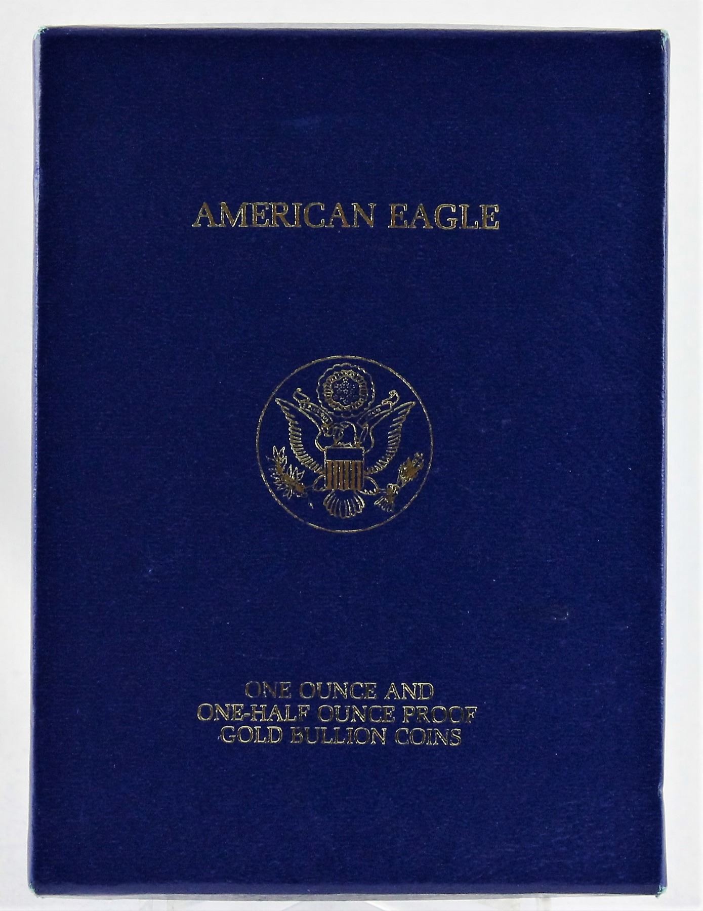 • This beautiful set contains the 1/2 oz (Philadelphia Mint) and 1 oz (West Point Mint) 1987 Gold American Eagle coins in Proof condition.