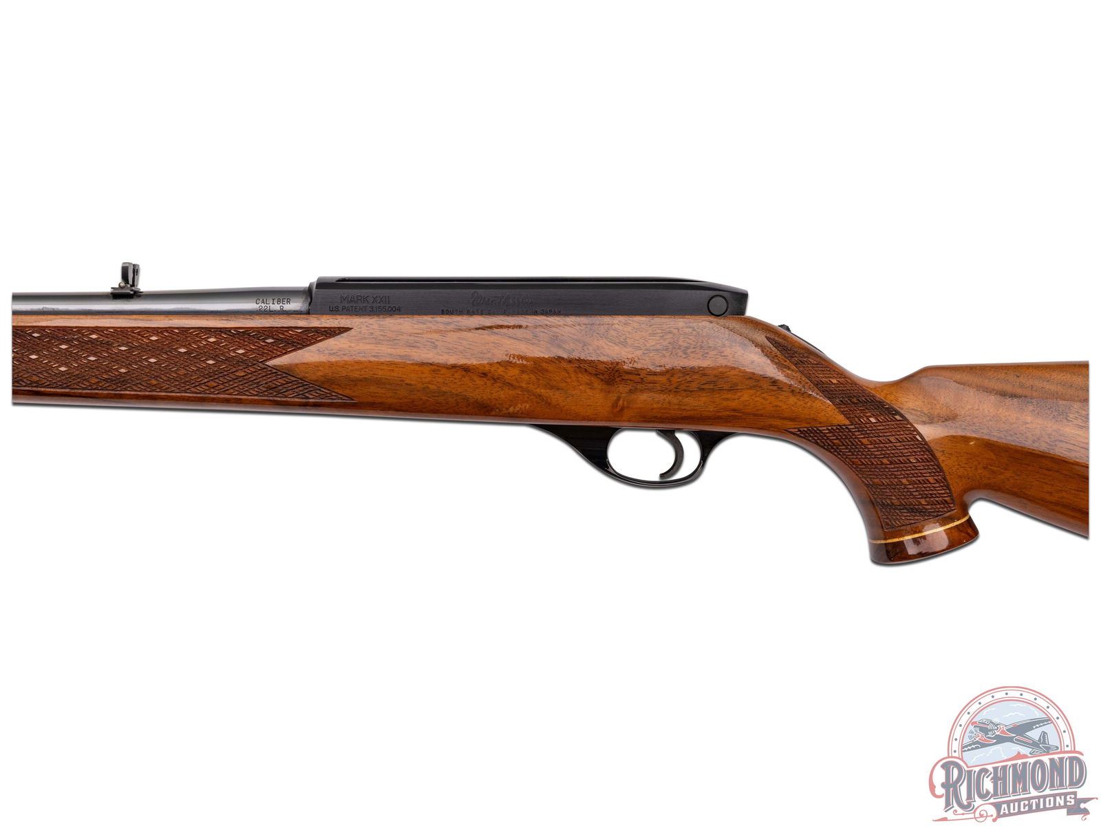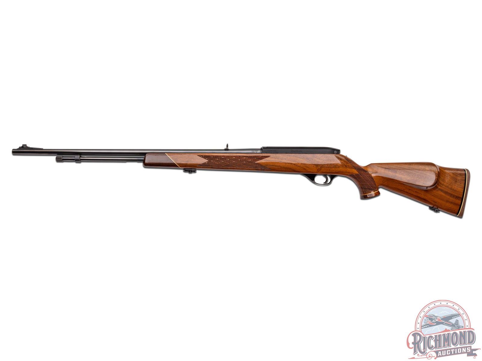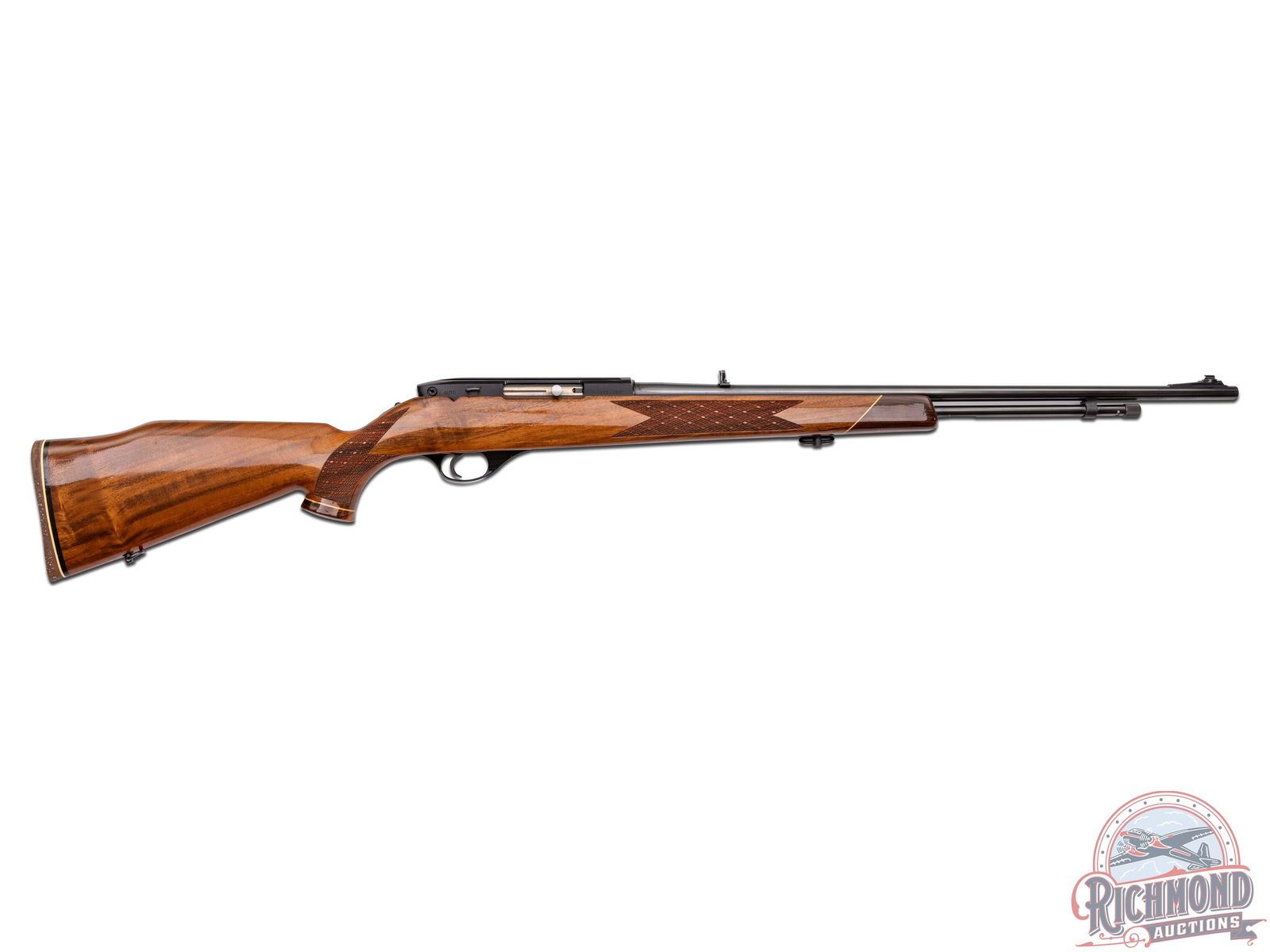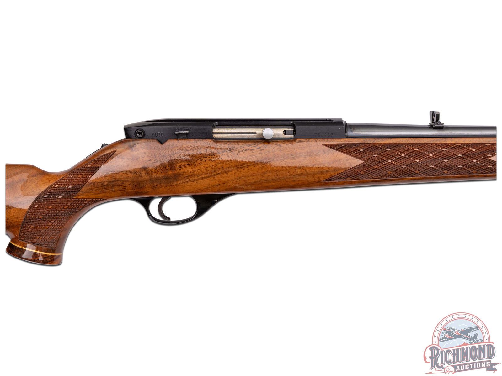 Manufactured circa 1987 by Weatherby in Japan. Features a 24" blued tapered barrel with flip-up rear leaf sight with white diamond insert and a front blade with brass bead sight. Tubular magazine feds a semi-automatic action. Blued receiver with dovetail groove. Tang mounted manual thumb safety and blued steel trigger guard. High gloss oak wood stock with skip-line checkering on pistol grip and forearm. Right side cheekpiece. White lined Rosewood forearm tip and pistol grip cap with white diamond inlay. Fitted with a black and white lined factory brown recoil pad and equipped with sling swivels. LOP: 13-1/2". CALIBER: 22 LR. S/N: JT54287. FFL STATUS: Modern.