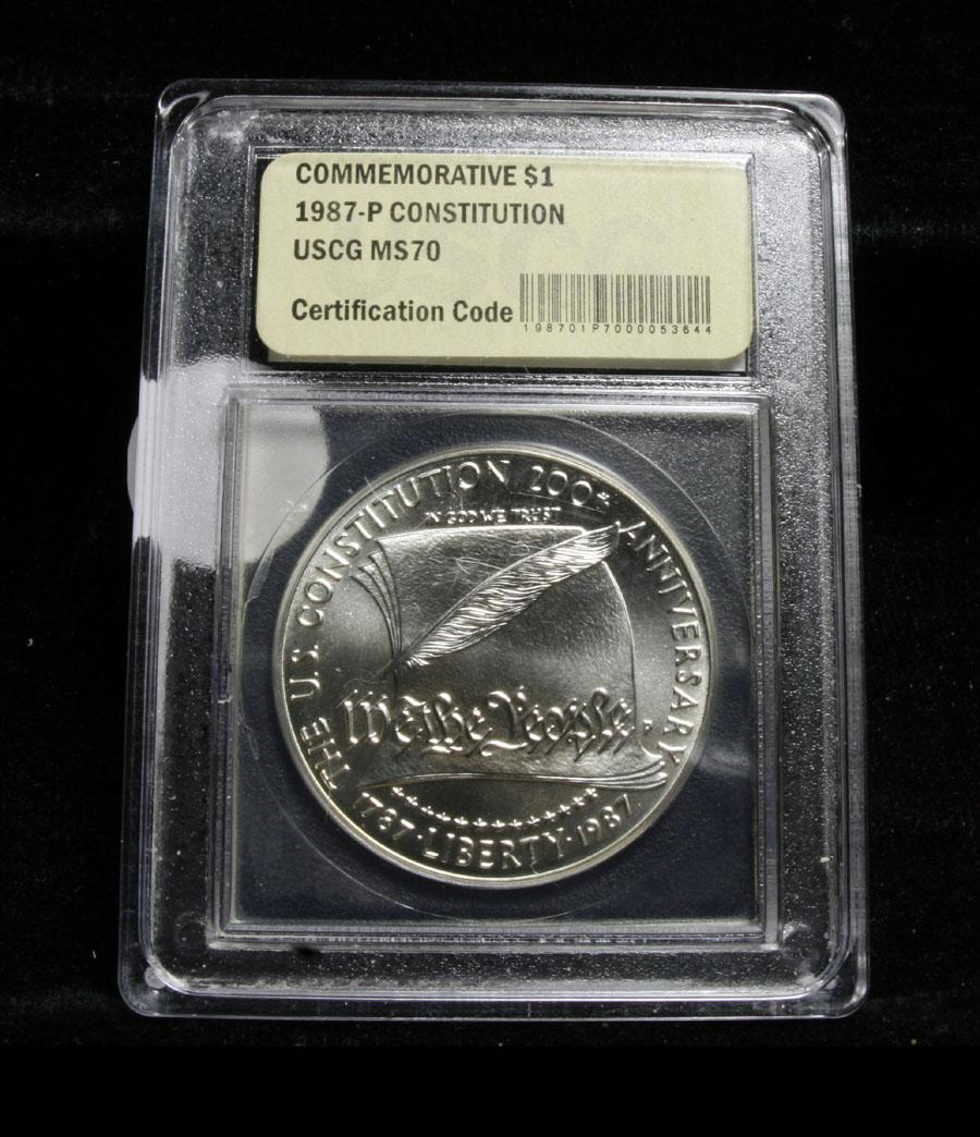 The 1987 Constitution Commemorative Silver Dollar was issued to celebrate the bicentennial of the United States Constitution, which took place in 1987. PCGS lists as ms70 at $410. This example is graded Perfection ms70 by USCG. Estimated Value $125
