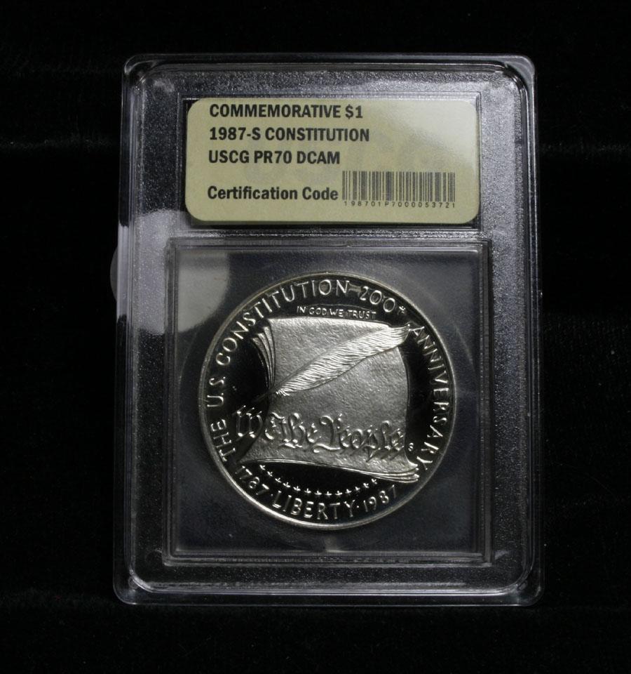 The 1987 Constitution Commemorative Silver Dollar was issued to celebrate the bicentennial of the United States Constitution, which took place in 1987. PCGS lists as ms70 at $410. This example is graded Perfection ms70 by USCG. Estimated Value $125