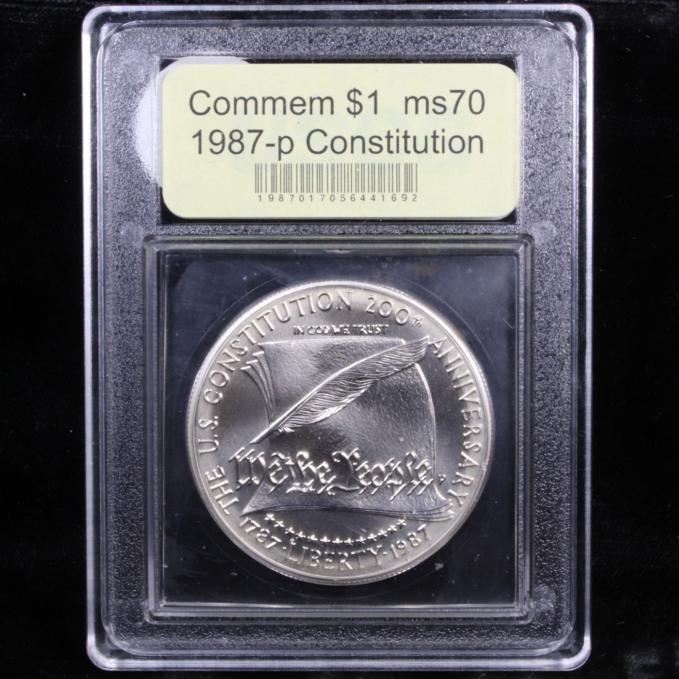 1987-p Constitution Bicentennial Modern Commem Dollar $1 Graded ms70, Perfection By USCG. The 1987 Constitution Commemorative Silver Dollar was issued to celebrate the bicentennial of the United States Constitution, which took place in 1987. This example is graded Perfection ms70 by USCG.