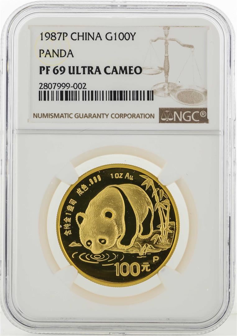 One 1987P China 100 Yuan Panda Gold Coin NGC PF69 Ultra Cameo. NGC Certified.