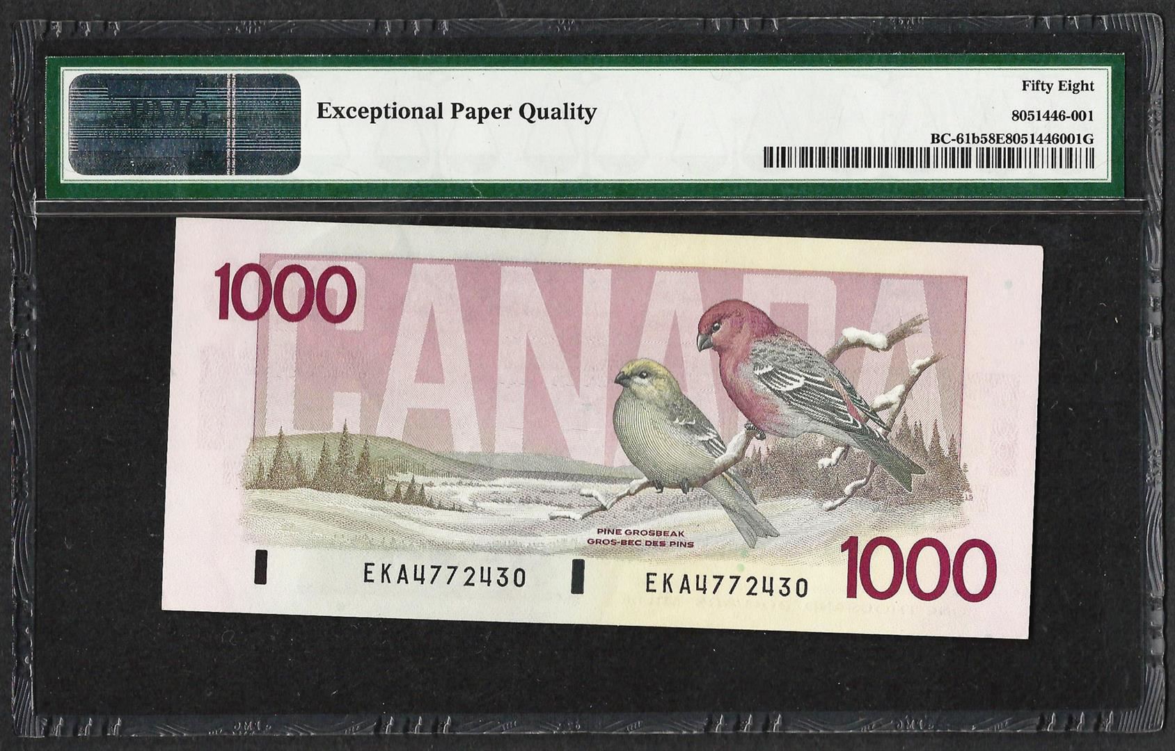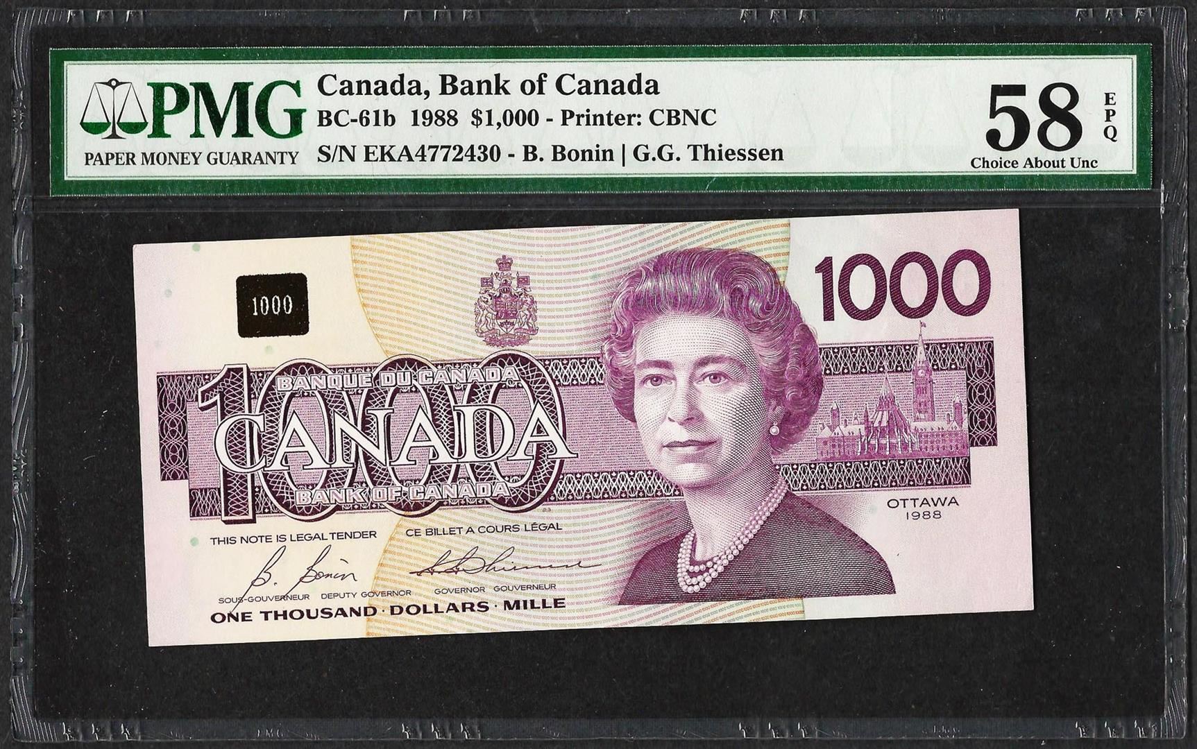 One 1988 $1,000 Canada Bird Note BC-61b PMG Choice About Uncirculated 58EPQ. PMG Certified.