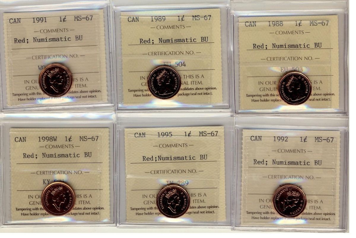1988 1¢, 1989, 1991, 1992, 1995,1998W, Lot of 6 coins all certified ICCS MS67 Numismatic BU Full R