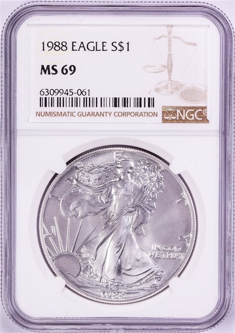 One 1988 $1 American Silver Eagle Coin NGC MS69. NGC Certified.