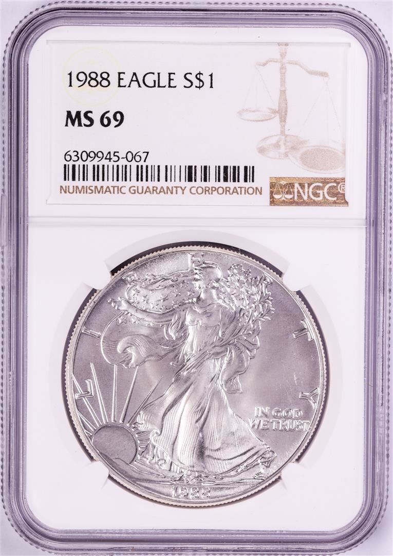 One 1988 $1 American Silver Eagle Coin NGC MS69. NGC Certified.