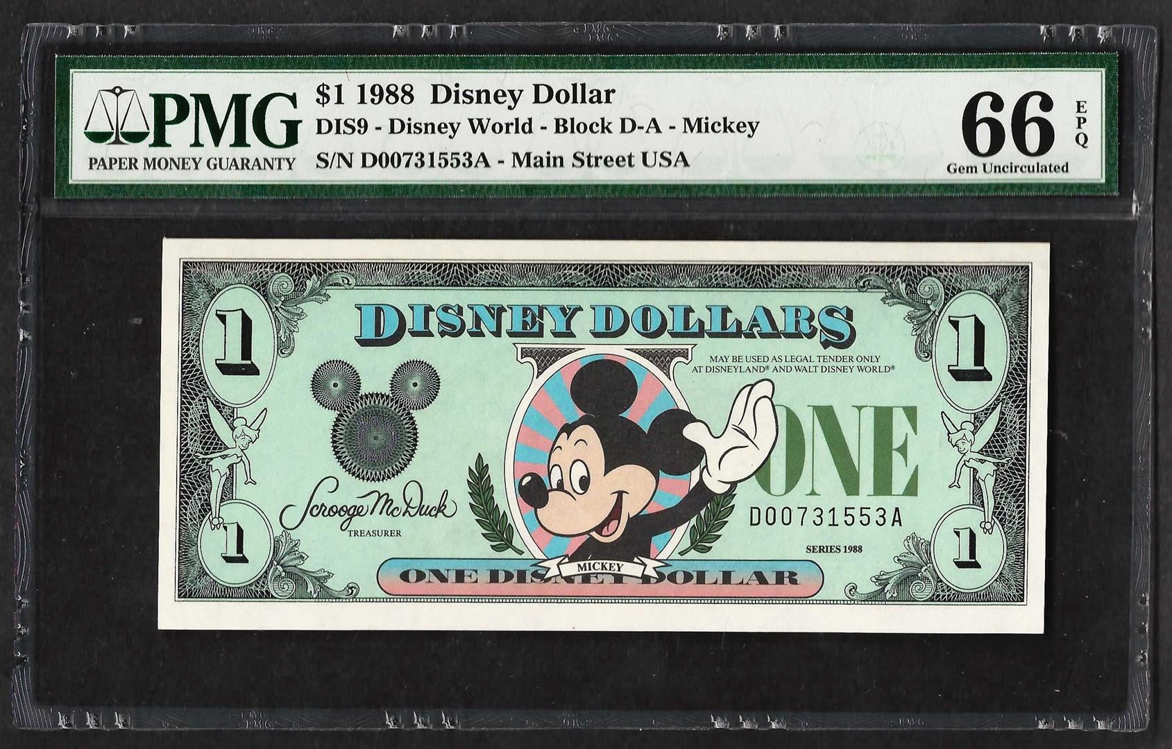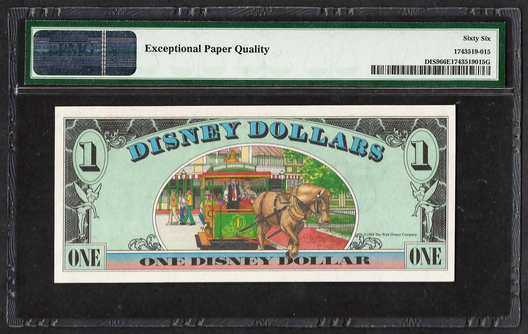 One 1988 $1 Disney Dollars Note PMG Gem Uncirculated 66EPQ.