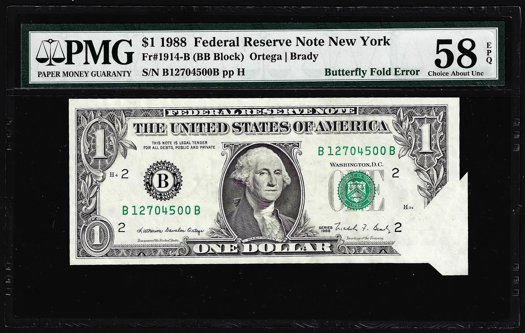 One 1988 $1 Federal Reserve Note New York Butterfly Fold ERROR PMG CH. About Unc 58EPQ. PMG Certified.