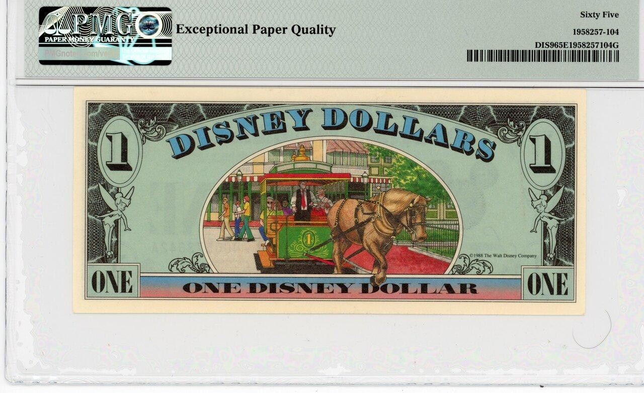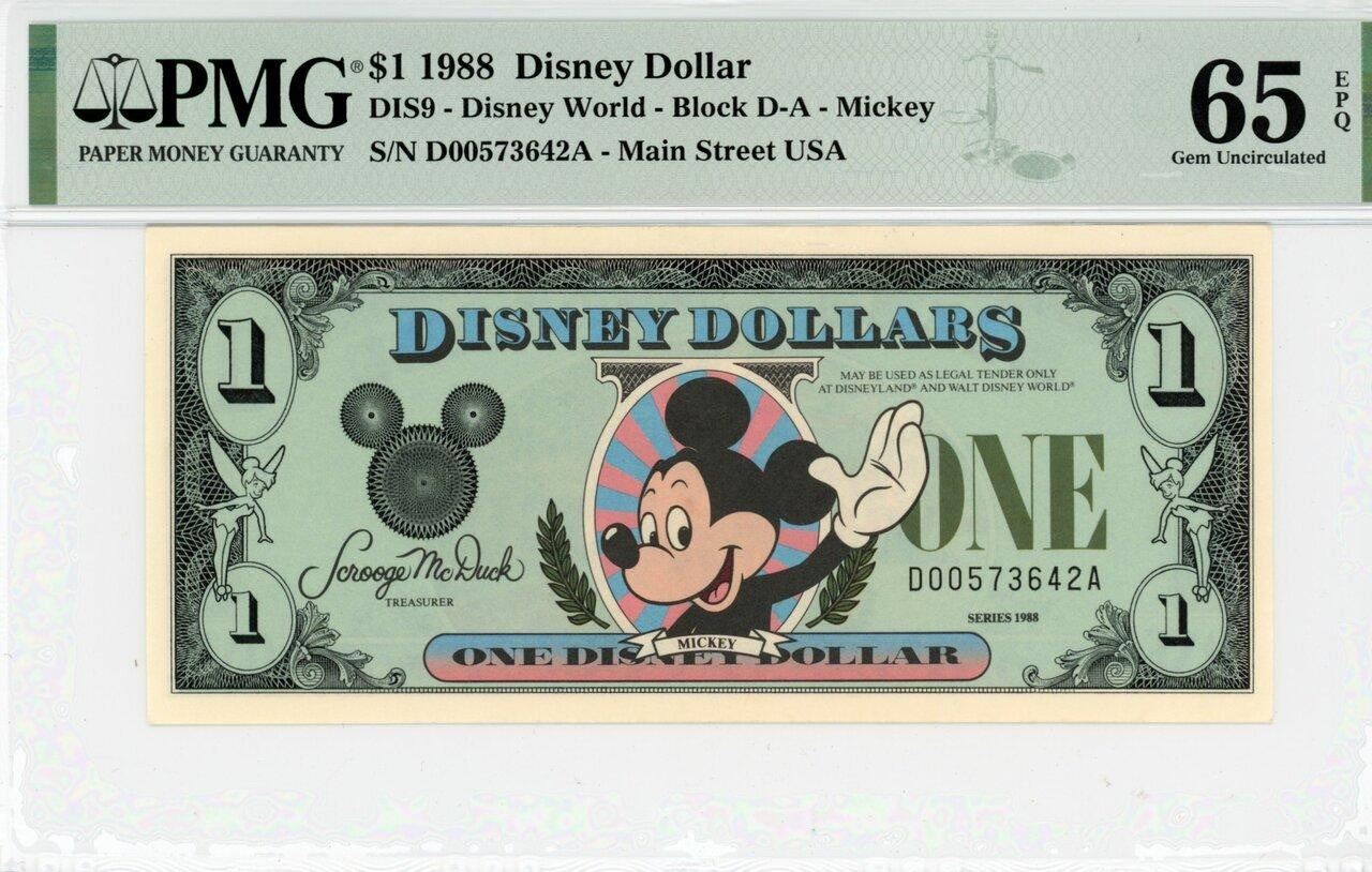 One 1988 $1 Mickey Disney Dollar PMG 65EPQ.