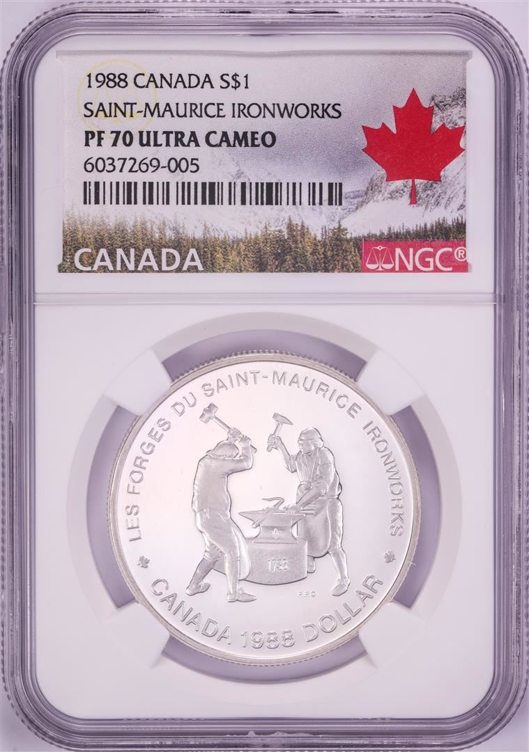 One 1988 $1 Proof Canada Saint-Maurice Ironworks Silver Dollar Coin NGC PF70 Ultra Cameo.