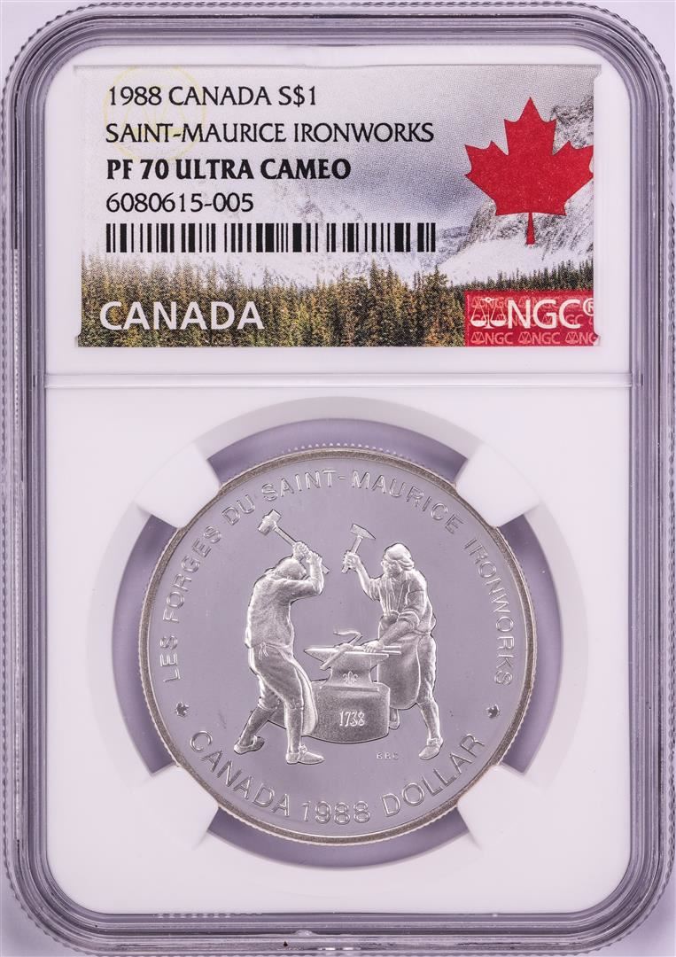 One 1988 $1 Proof Canada Saint-Maurice Ironworks Silver Dollar Coin NGC PF70 Ultra Cameo. NGC Certified.