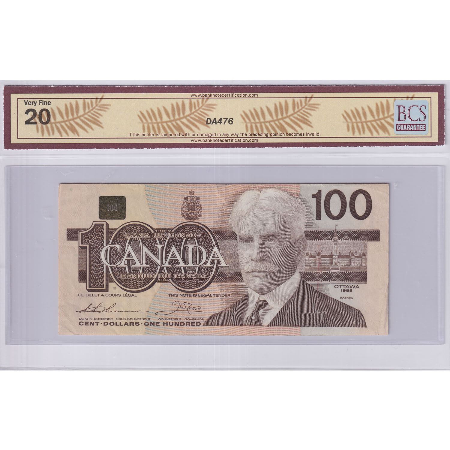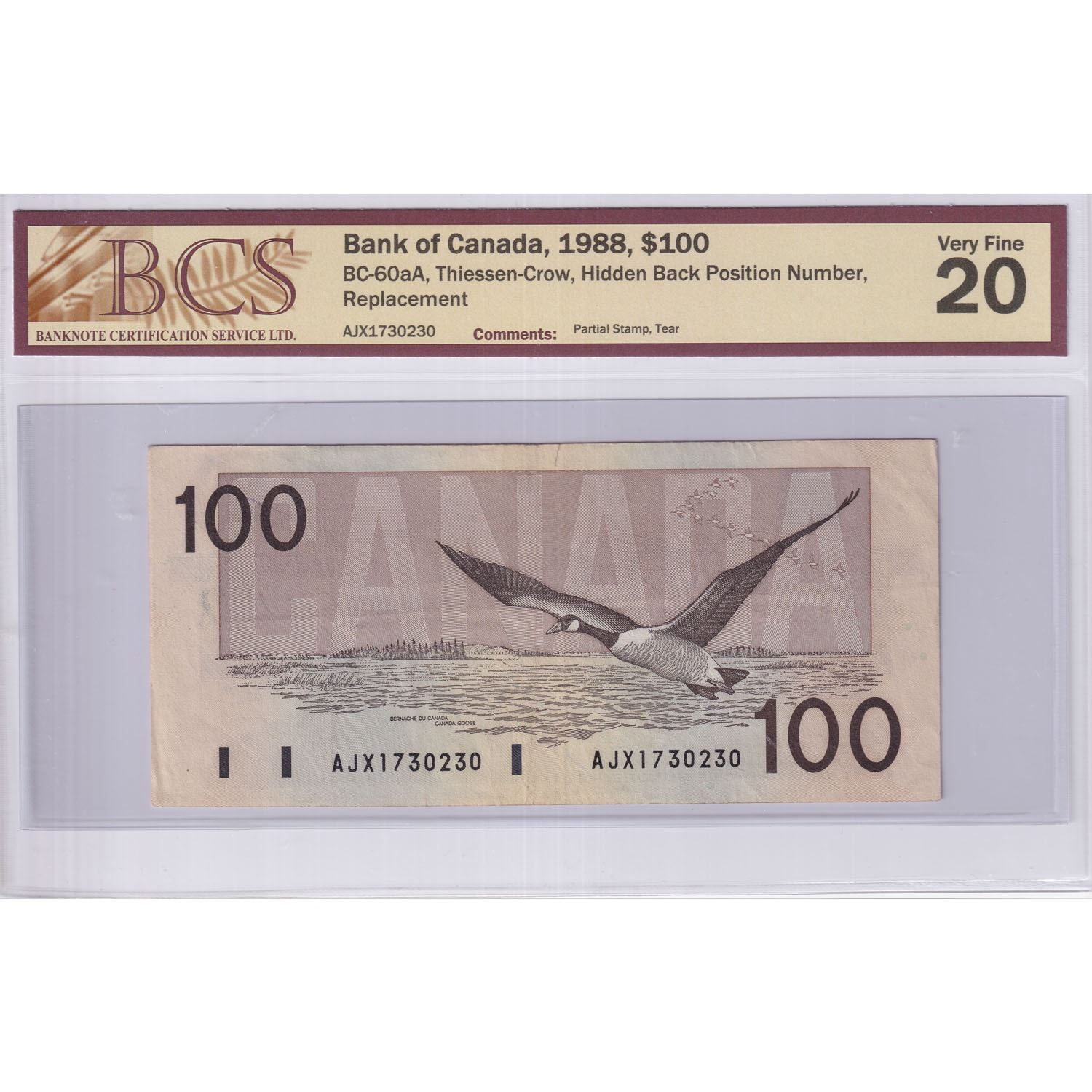 1988 $100 BC-60aA, Bank of Canada, Thiessen-Crow, Hidden Back Position Number, Replacement, S/N: AJX1730230, BCS Certified VF-20 (Partial Stamp, small tear).