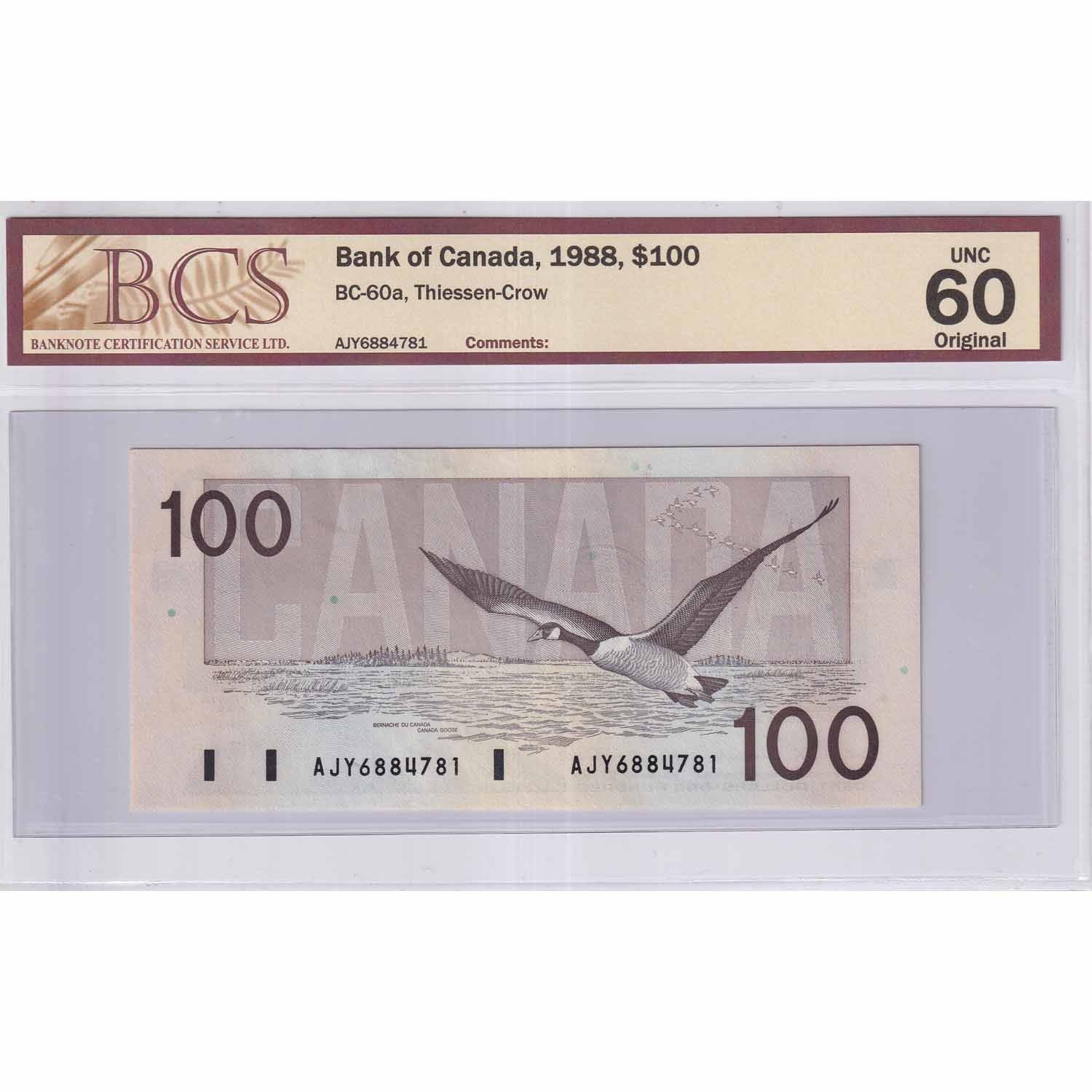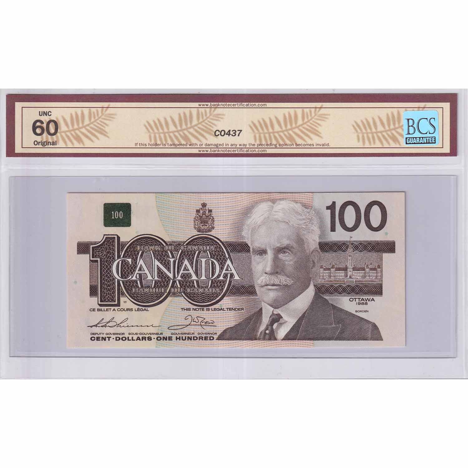 1988 $100 Bc-60a, Bank of Canada, Thiessen-Crow, AJY Prefix BCS Certified UNC-60