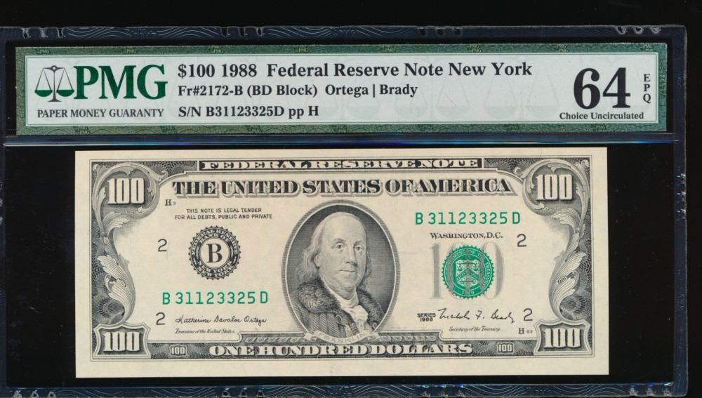 One 1988 $100 New York Federal Reserve Note PMG 64EPQ.