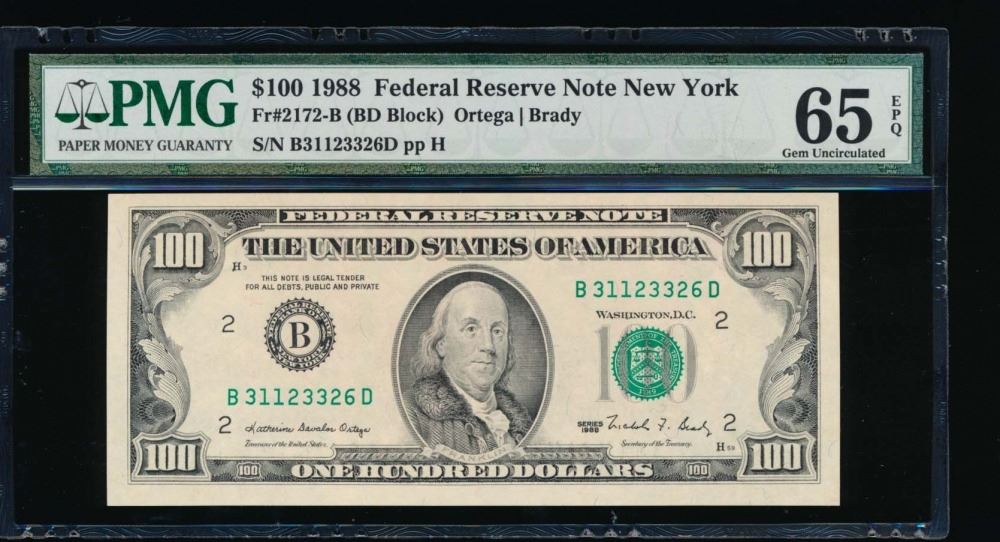One 1988 $100 New York Federal Reserve Note PMG 65EPQ.