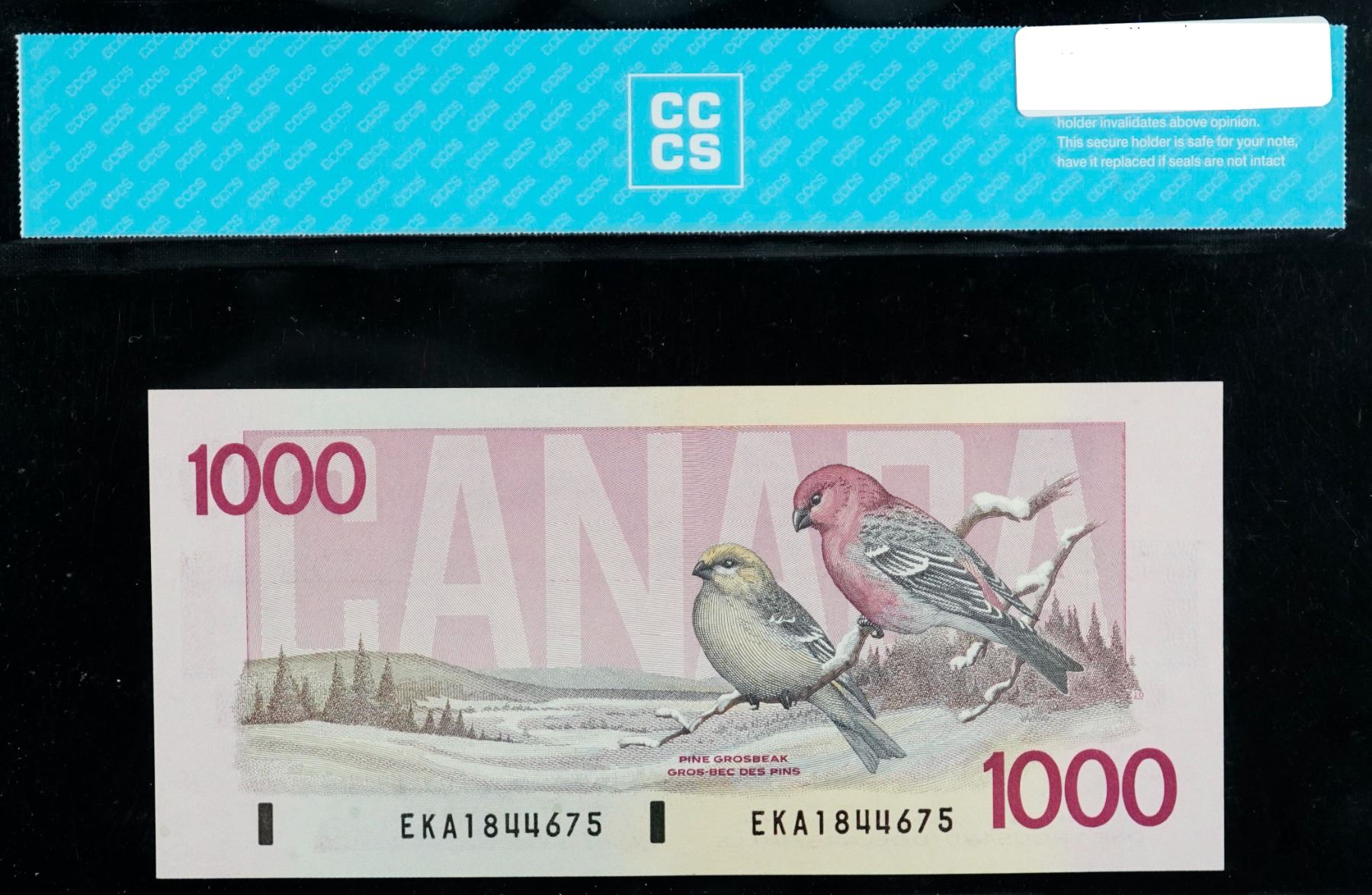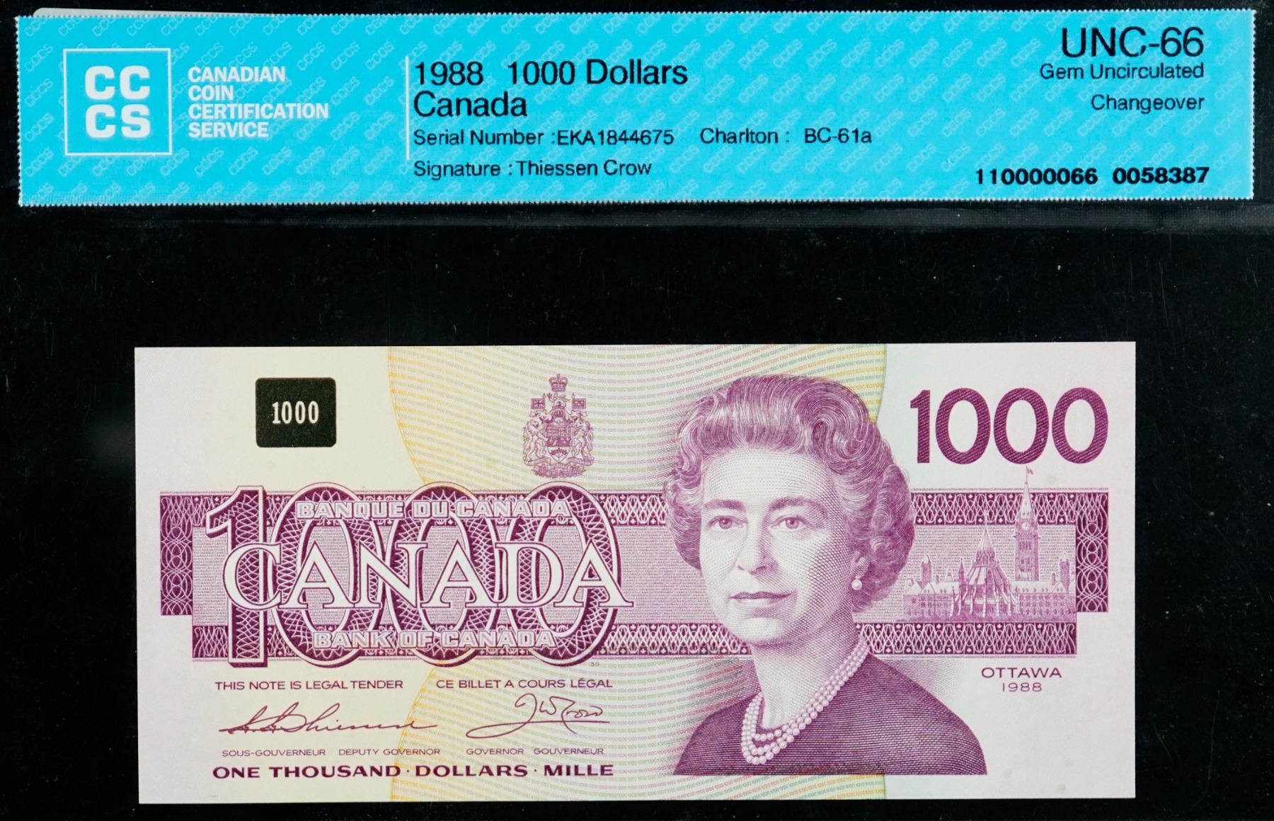 1988 $1000 BC-61a #EKA1844675 CCCS Superb Gem Uncirculated-66. This is a pristine issue with great eye appeal, good margins and superb embossing.