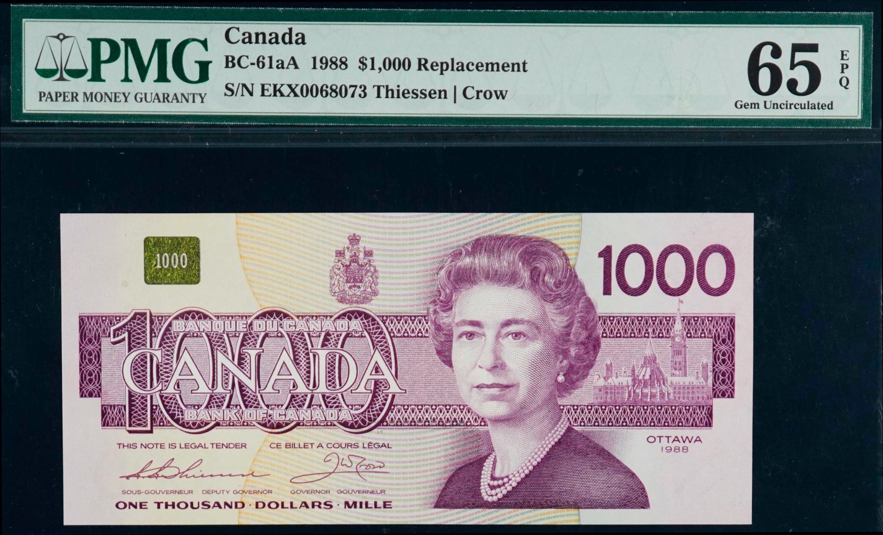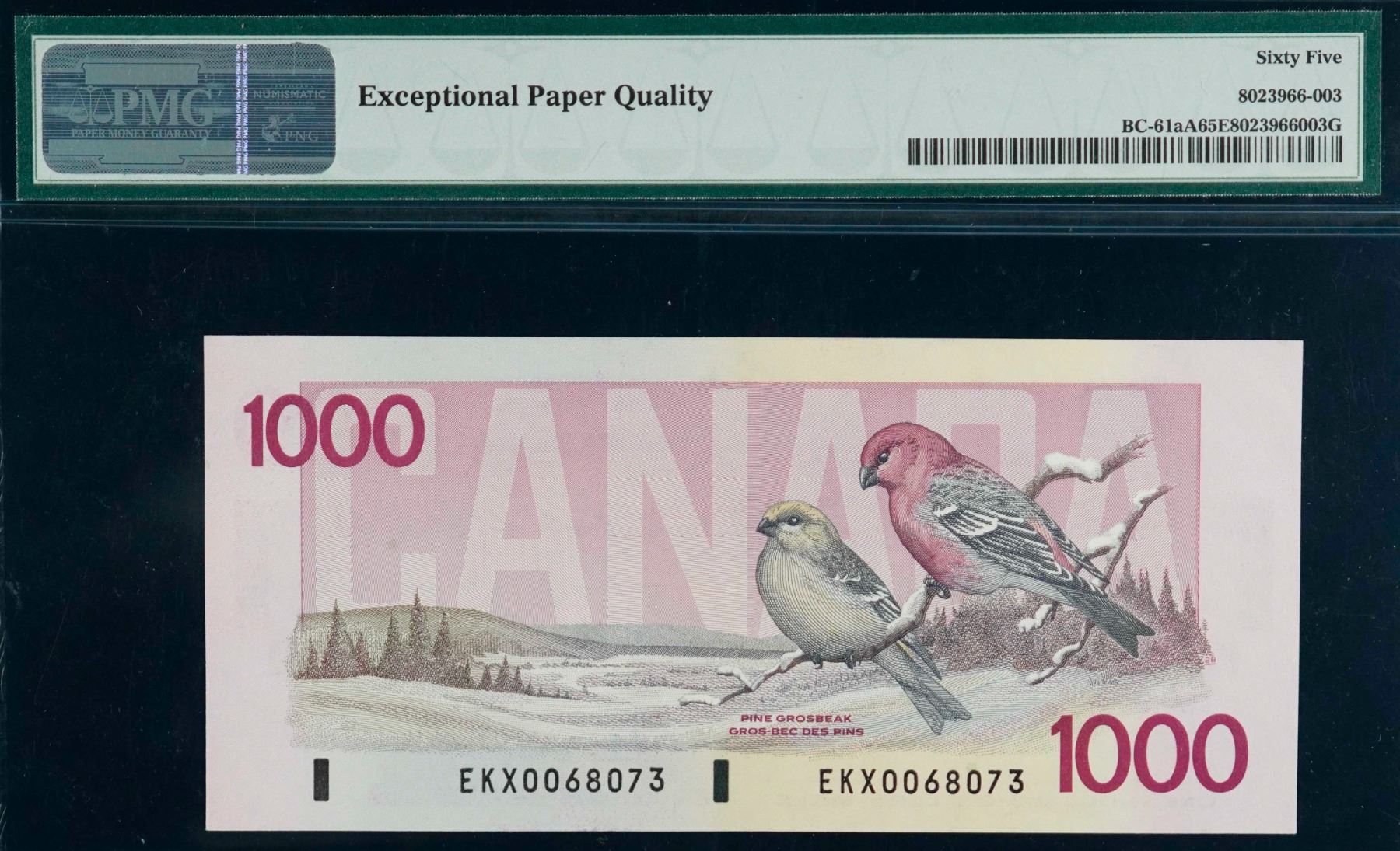 1988 $1000 BC-61aA #EKX0068073 PMG Gem Uncirculated-65EPQ. This is a pristine issue with great eye appeal, good margins and superb embossing.