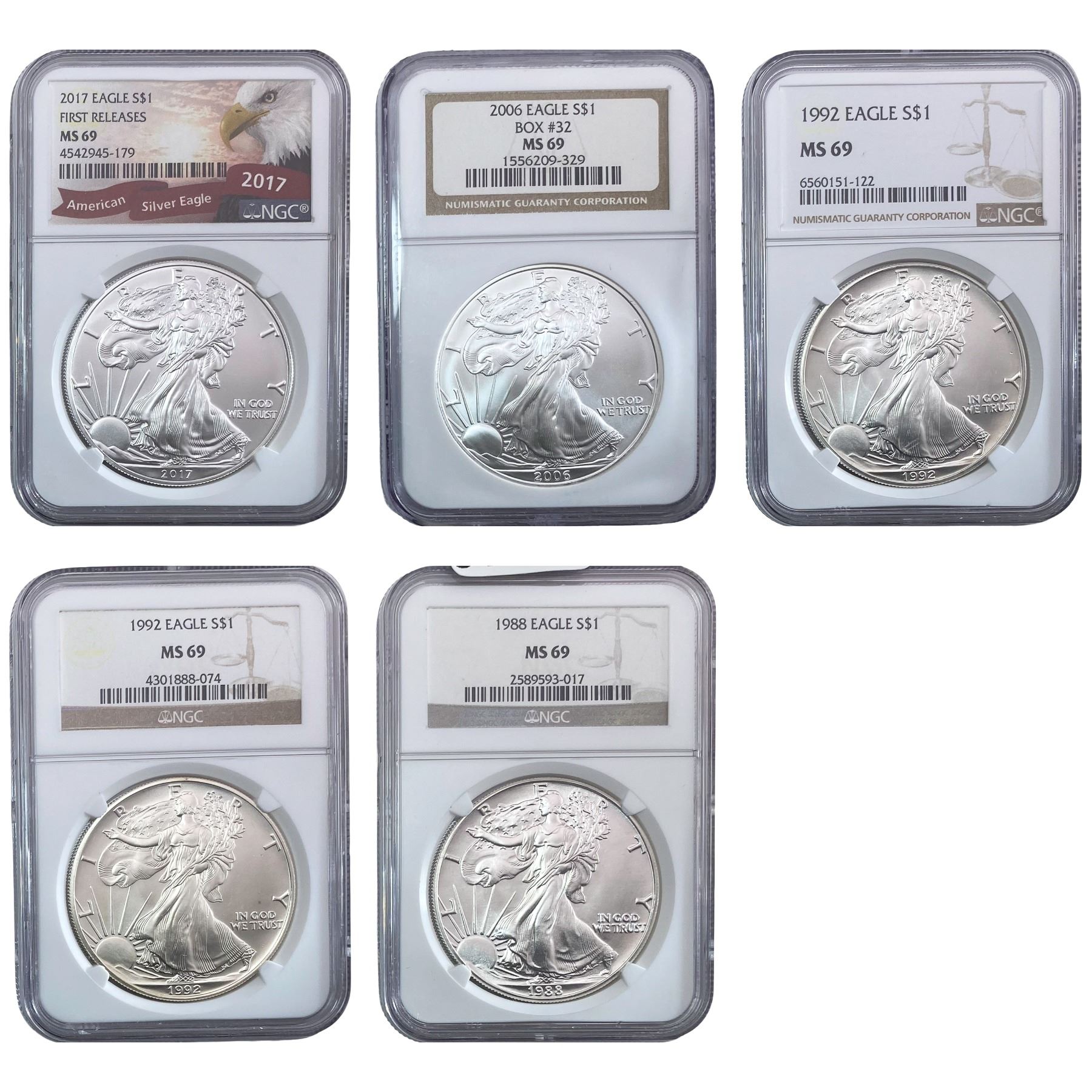 1988-2017 GEM BU Silver Eagle [5 Coins] NGC MS69