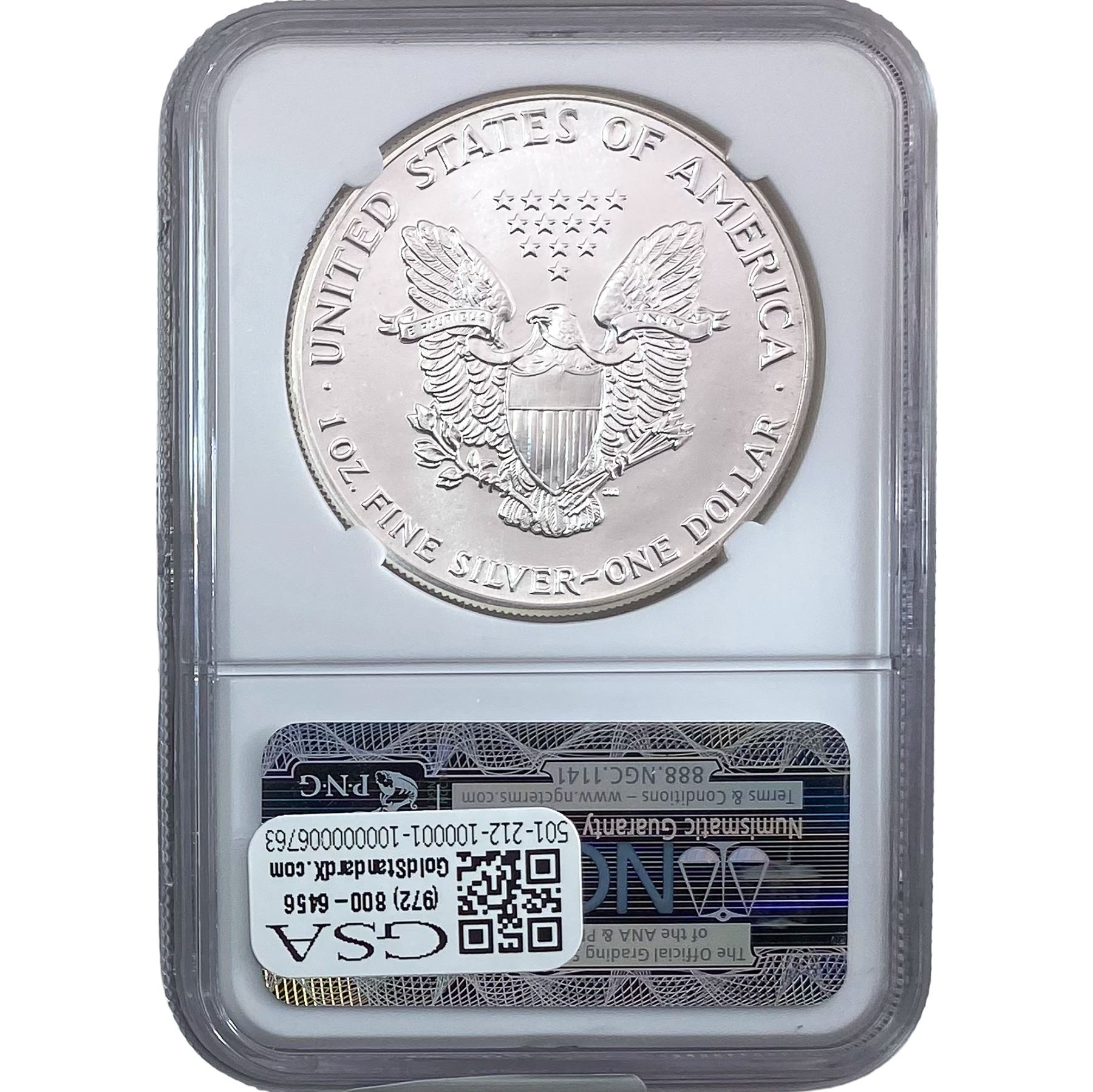 e. Coins sold referencing a third-party grading service are sold “AS IS” without any express or implied warranty, except for a guarantee by GSA that they are genuine. Removal or alteration of the holder, voids all of Bidder’s claims concerning that Product. Certain warranties may be available from the grading services and Bidders are referred to them for further details: Numismatic Guaranty Corporation (NGC), PO Box 4776, Sarasota, FL 34230, www.ngccoin.com/services/writtenguarantee.asp; Professional Coin Grading Services (PCGS), PO Box 9458, Newport Beach, CA 92658, www.pcgs.com/guarantee.html; ANACS, 6555 S. Kenton St., Ste. 303, Englewood, CO 80111; and Independent Coin Grading Co. (ICG), 7901 East Bellview, Ave., Suite 50, Englewood, CO 80111.