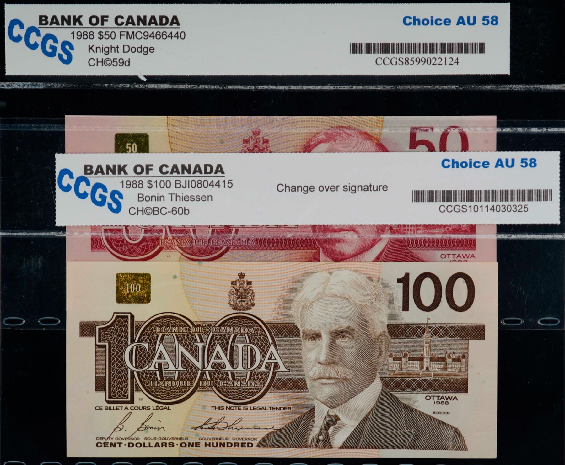 1988 $50 & $100; Includes various signatures, prefixes and grades. Both notes CCGS Choice About Uncirculated-58