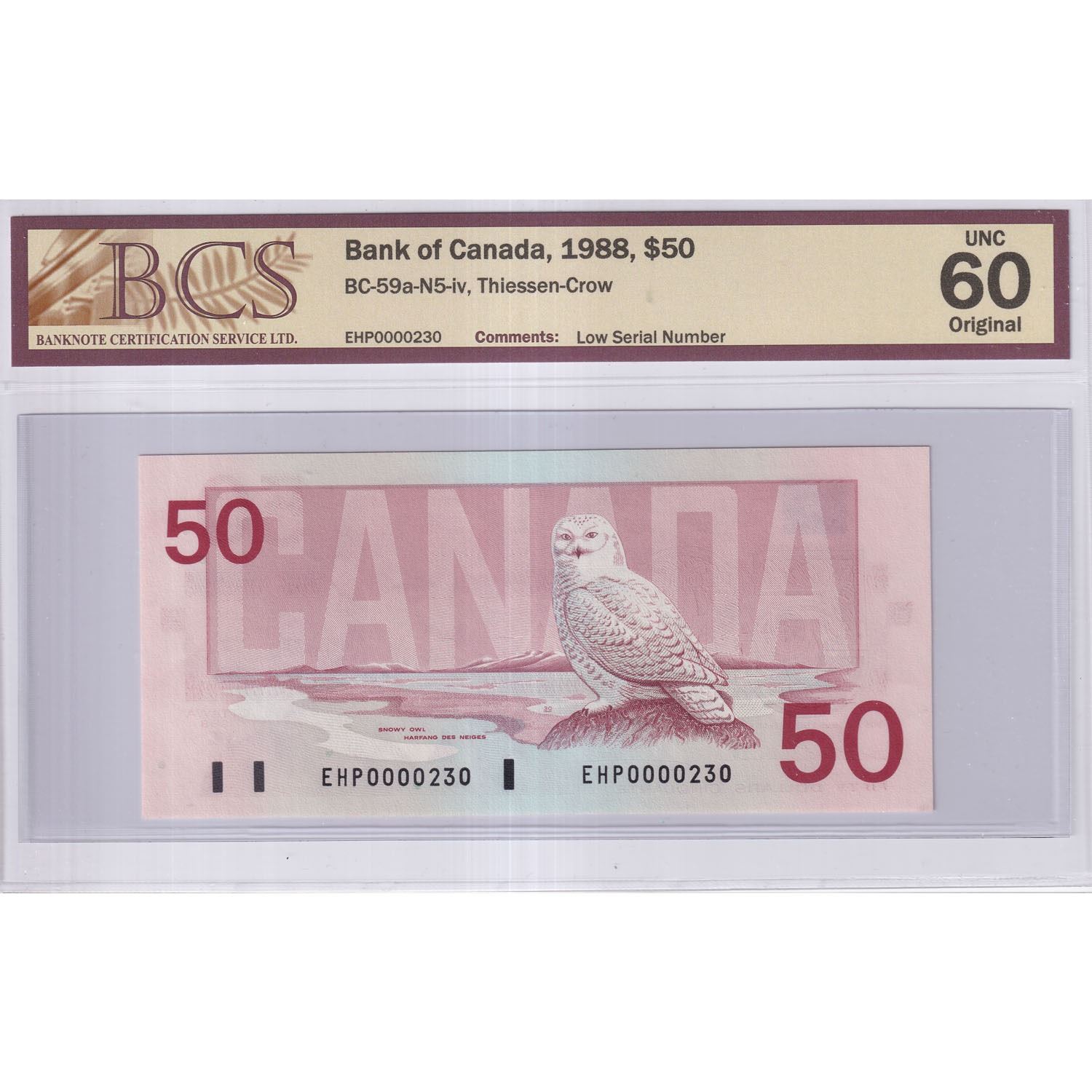 1988 $50 BC-59a-N5-iv, Bank of Canada, Thiessen-Crow, Low Serial Number EHP0000230, BCS Certified UNC-60 Original.