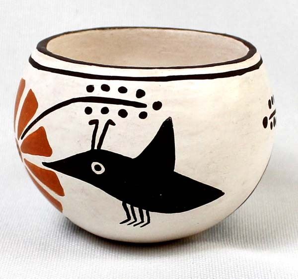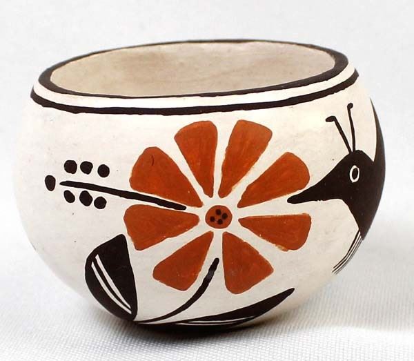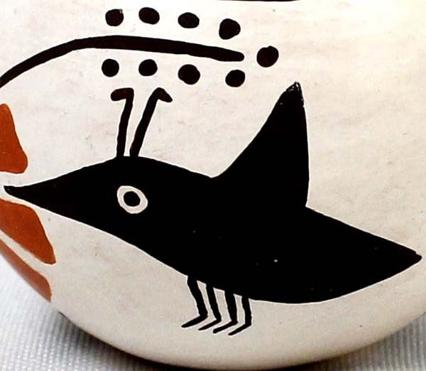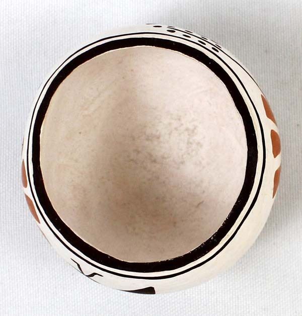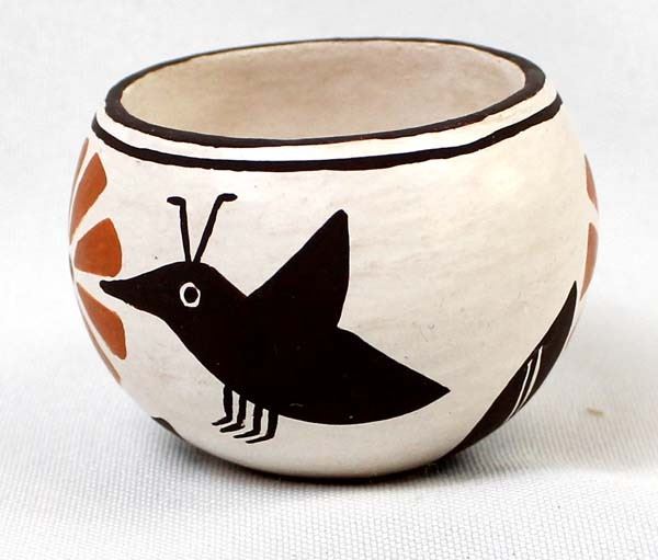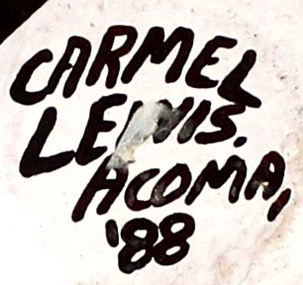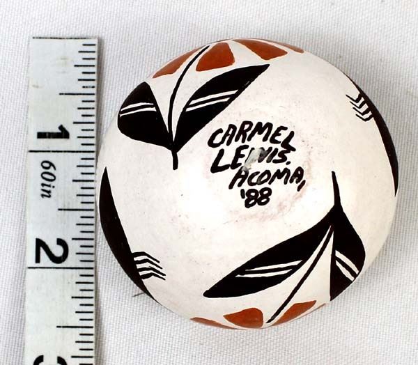 1988 Native American Acoma Pottery Jar by Carmel Lewis (1947-2019), measures 1.5'' x 2'' and is signed on the bottom, FYI: ''Carmel Lewis was born into the Acoma Sky City Pueblo in 1947. She is the youngest daughter of the world-renowned, late Lucy M. Lewis. Lucy was Carmel's biggest inspiration for learning the ancient traditional methods of working with natural handmade pottery.''